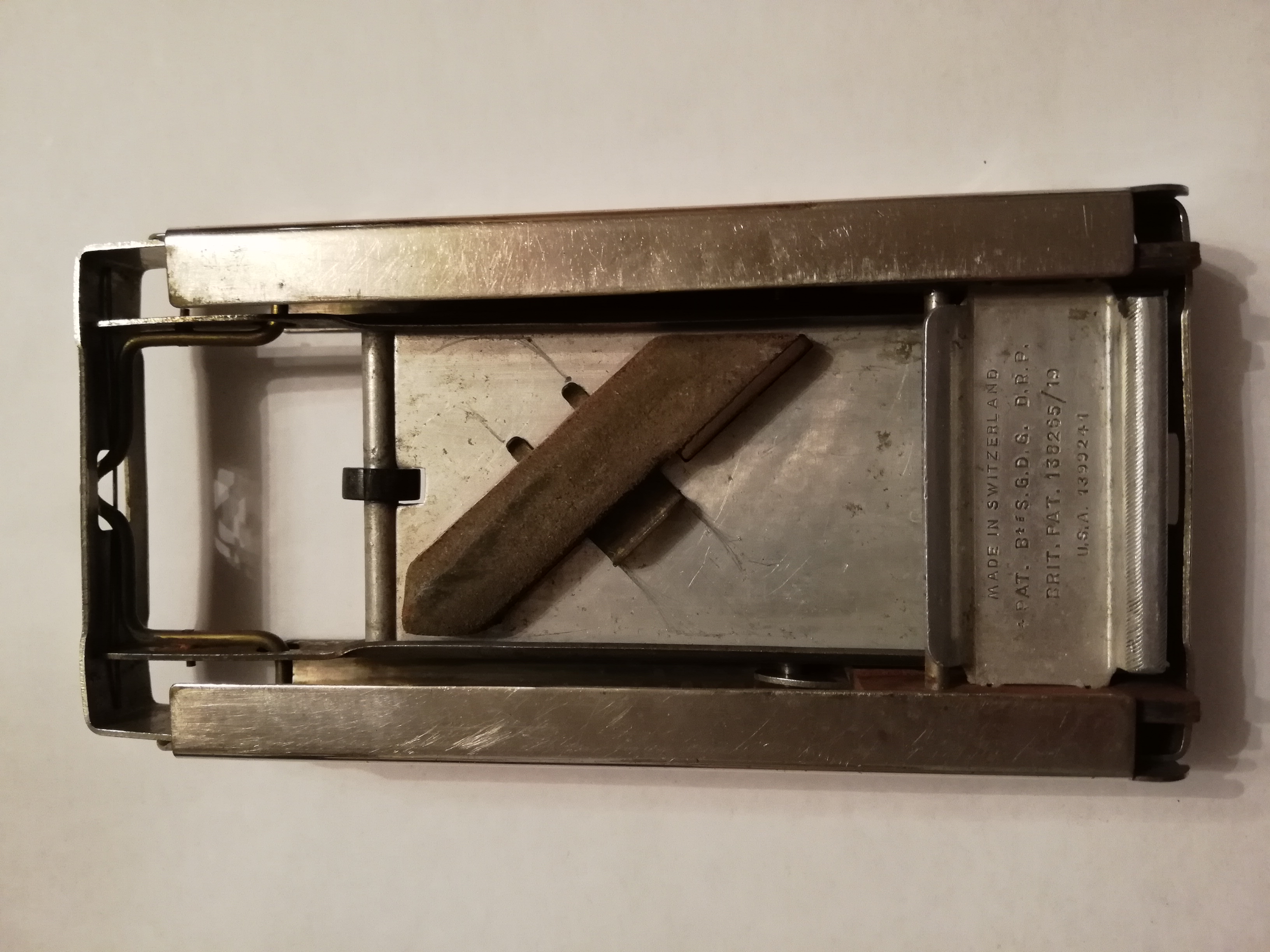 ОценкаБритва-то хорошая, но форма заметно испорчена: ширина полотна у пятки больше, чем у носика; закругление неровное. Видимо, использовалась не по назначению -- резали линолеум, вскрывали коробки... Для придания товарного вида требуются реставрационные работы.