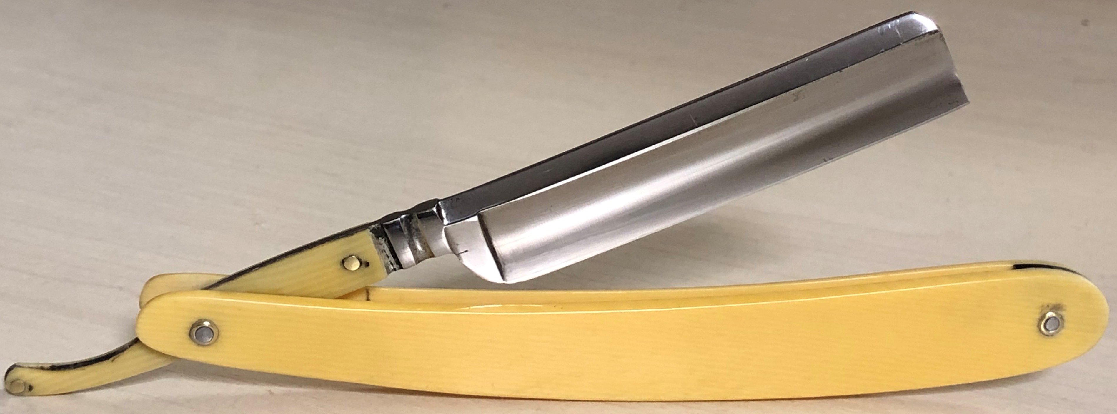 Ширина полотна-17 мм Толщина обушка-4.3 мм Полная вогнутость. Углеродистая сталь. (По всей видимости бритвы изготовлена для американского рынка, либо в самой Америке, в первой половине 20-го века). Бритва в очень хорошем состоянии для своих лет. Следов активного пользования не замечено:обушок не имеет уточки от заточных камней.Лицевая сторона полотна имеет оригинальный вид. Только полиролью по металлу протер и все.Обратную сторону немного почистил.Поменял пины на немецкие втулки. Очень приличная,"звонкая" сталь, идеальная геометрия клинка,ромбовидная форма обушка, вкупе с пластиковыми накладками на эрле, придают бритве оригинальный и красивый вид.Можно смело рекомендовать в качестве первой бритвы новичку. Но и опытный пользователь также оценит все преимущества данного экземпляра. Перед отправкой будет до конца заточена и доведена до комфортного бритья. Цена-5500 р с доставкойПРОДАН Внимание! Важная информация! Spoiler Show