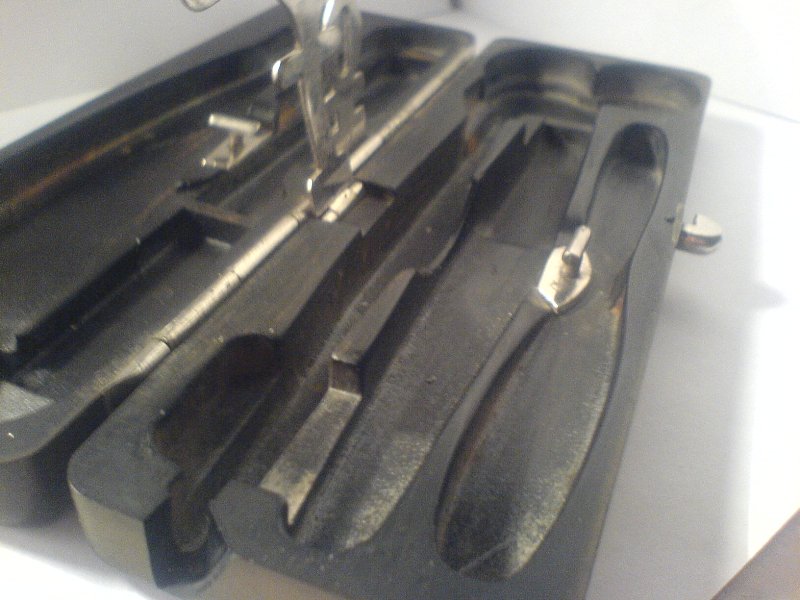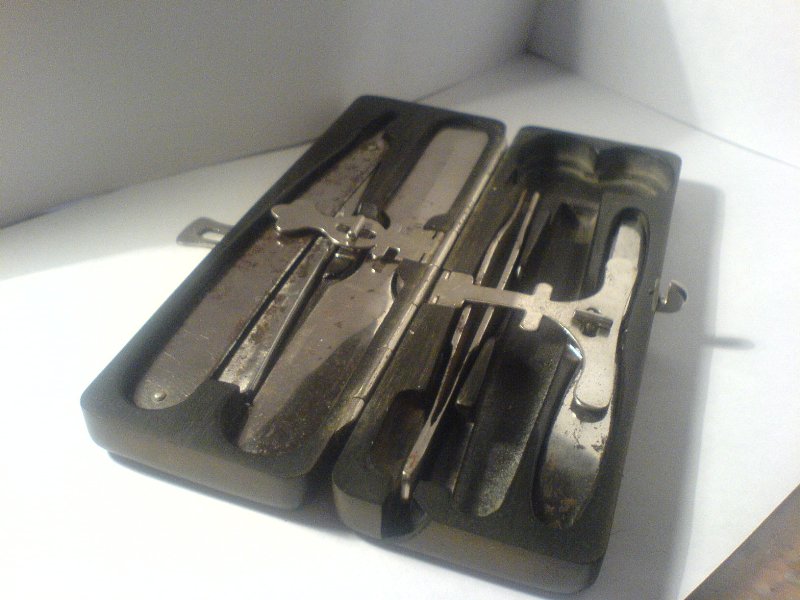Вот такой наборчик ухватил на барахолке . Ранее встречал такое клеймо на прочих медицинских инструментах, таких как зажимы, те же странные "ножички", коих у меня в шкатулке два (мои личные подозрения что оба предназначались для кровопускания, но точных данных нет, так что если кто знает - говорите) и "лопатка" (хотя может быть ей смотрели в горло, не как сейчас, деревянной палочкой от мороженного :) ). На клейме двуглавый орёл, под ним буквы И О, ещё ниже З(?) В В З. Фу-ух... Пока всё :)