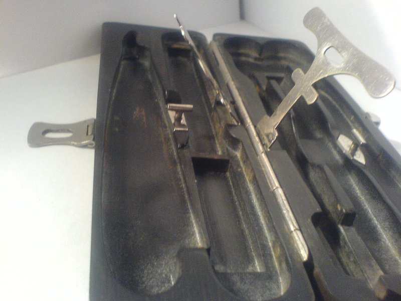 Вот такой наборчик ухватил на барахолке . Ранее встречал такое клеймо на прочих медицинских инструментах, таких как зажимы, те же странные "ножички", коих у меня в шкатулке два (мои личные подозрения что оба предназначались для кровопускания, но точных данных нет, так что если кто знает - говорите) и "лопатка" (хотя может быть ей смотрели в горло, не как сейчас, деревянной палочкой от мороженного :) ). На клейме двуглавый орёл, под ним буквы И О, ещё ниже З(?) В В З. Фу-ух... Пока всё :)