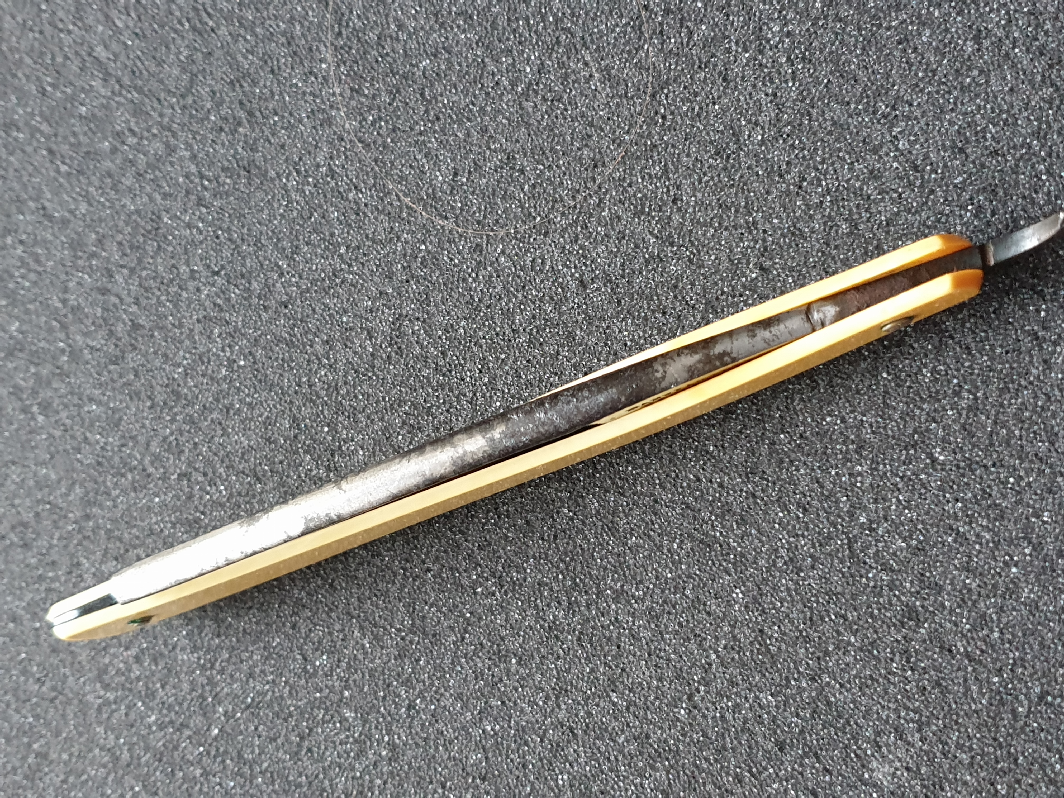 Продаётся от S&T83. Американка Clauss (Fremont Ohio) из предположительно 1920-1930-х годов, под ремонт (укорочение клинка) и легкое восстановление. Трещина клинка на расстоянии 9мм от кончика носа при длине РК 70мм. Ширина клинка 20+мм. Ручка из бакелита, ровная, без трещин, есть пара процарапанных "персонализаций" владельца. Клинок почти совсем без коррозии и вероятно только на заводе был заточен, обух 5,5+мм. Пины родные, бритва не разбиралась, насечка на эрле чистая. Клинок паркуется в ручку ровно, без перекосов и закусываний. Продается "как есть".