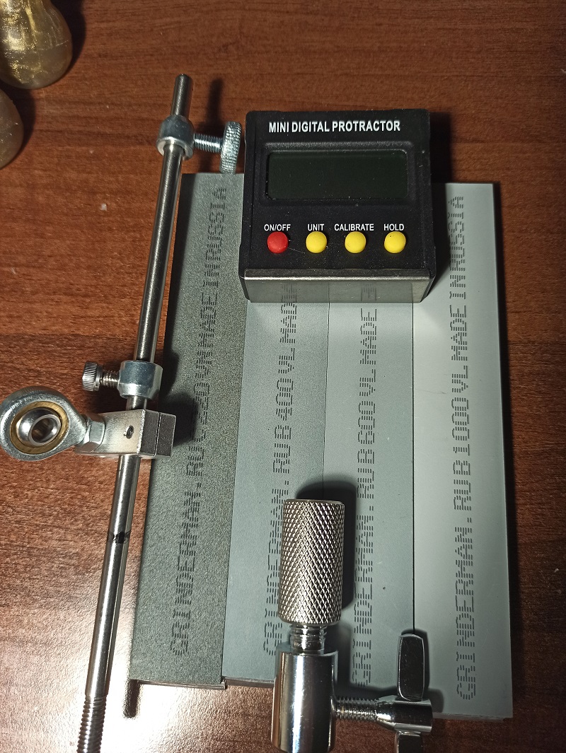 Кухонные ножи-способы заточки.Олег Бритва, На фото КИТ доработки этой Китайской точилки Руиксин про(самое ценное в ней узел поворота, который практически без люфтов). На фоне камней карбид кремния Гриндерман на бланках( стоимость 2тр, примерно) этого набора ЗА ГЛАЗА для практически любых ножей. Слева вертикальная стойка с зажимом и узлом скольжения, вверху угломер, внизу узел точной регулировки угла(не помню как называется точно, но применяется в музыкальных инструментах)надевается на вертикальную стойку снизу от зажима узла скольжения. Поворотом гайки можно точно регулировать угол заточки. Фанерку для увеличения базы не снял, но там все просто, крепление нужно удалить от старого на 7см примерно.Данные доработки этой точилки позволяют устранить ее конструктивные недостатки. Стоимость всех этих приблуд из Китая рублей 500