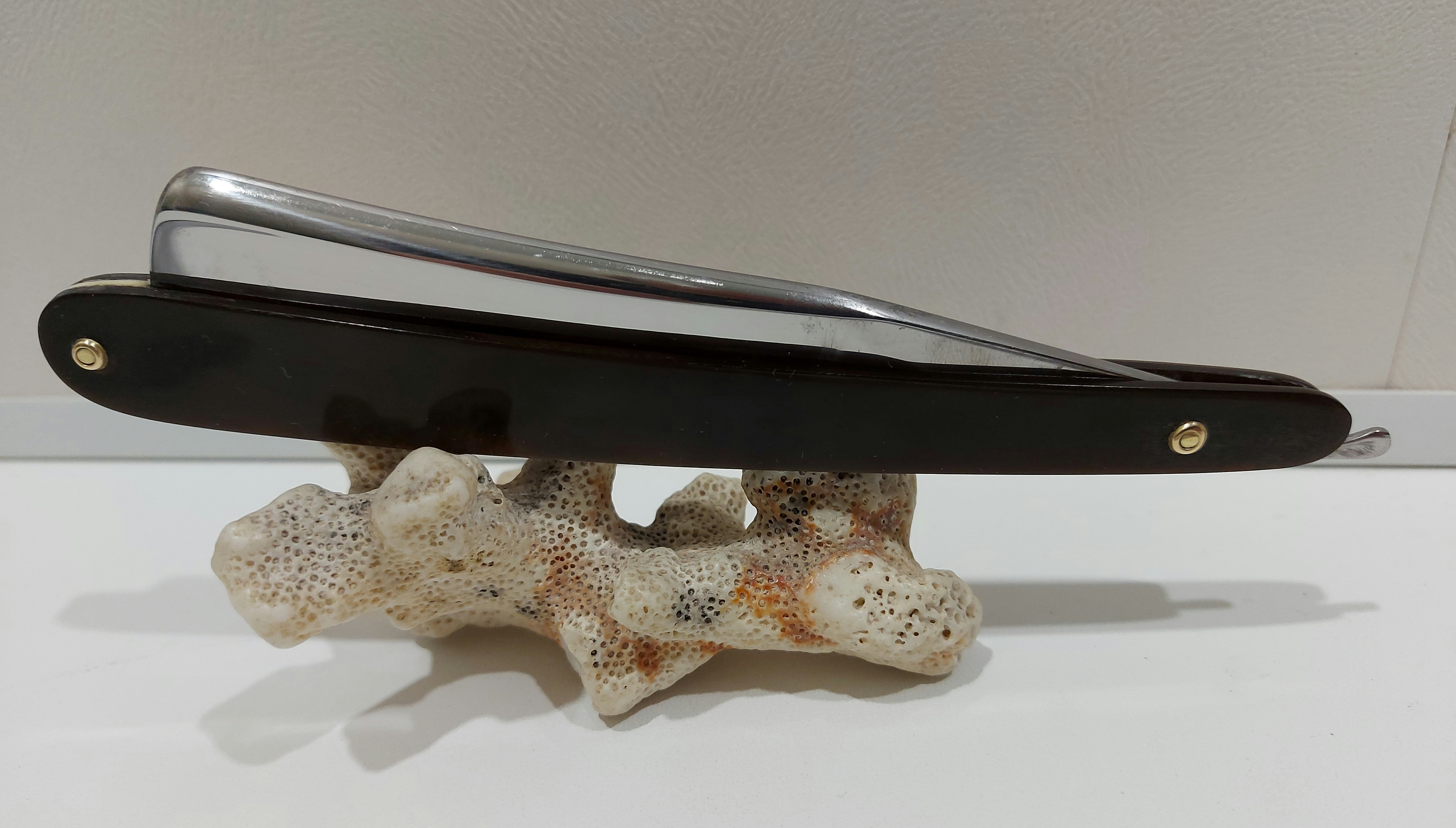 Бритва до... и после...У восстановленной мной бритвы толщина плашек 3 мм. Этого мне вполне хватило чтобы вставить штифты. А вот 2 мм конечно маловато.