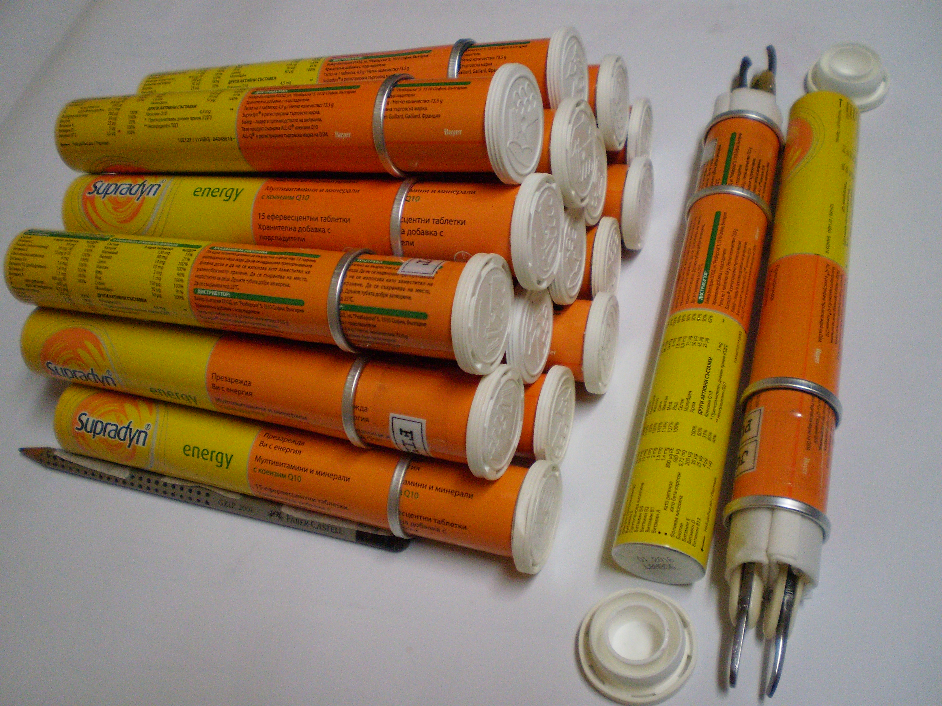 Футляр для опасной бритвыДля хранения законсервированных бритв изпользую алюминиевых флаконов из под витаминов „Supradin”. (Понасобирал у друзей и знакомых). Так как они не такие длинные, одного флакона разширяю, второго отрезаю, склеиваю попарно эпоксидкой и получается футляр для двух бритв. Если бритва крупная – для одной.