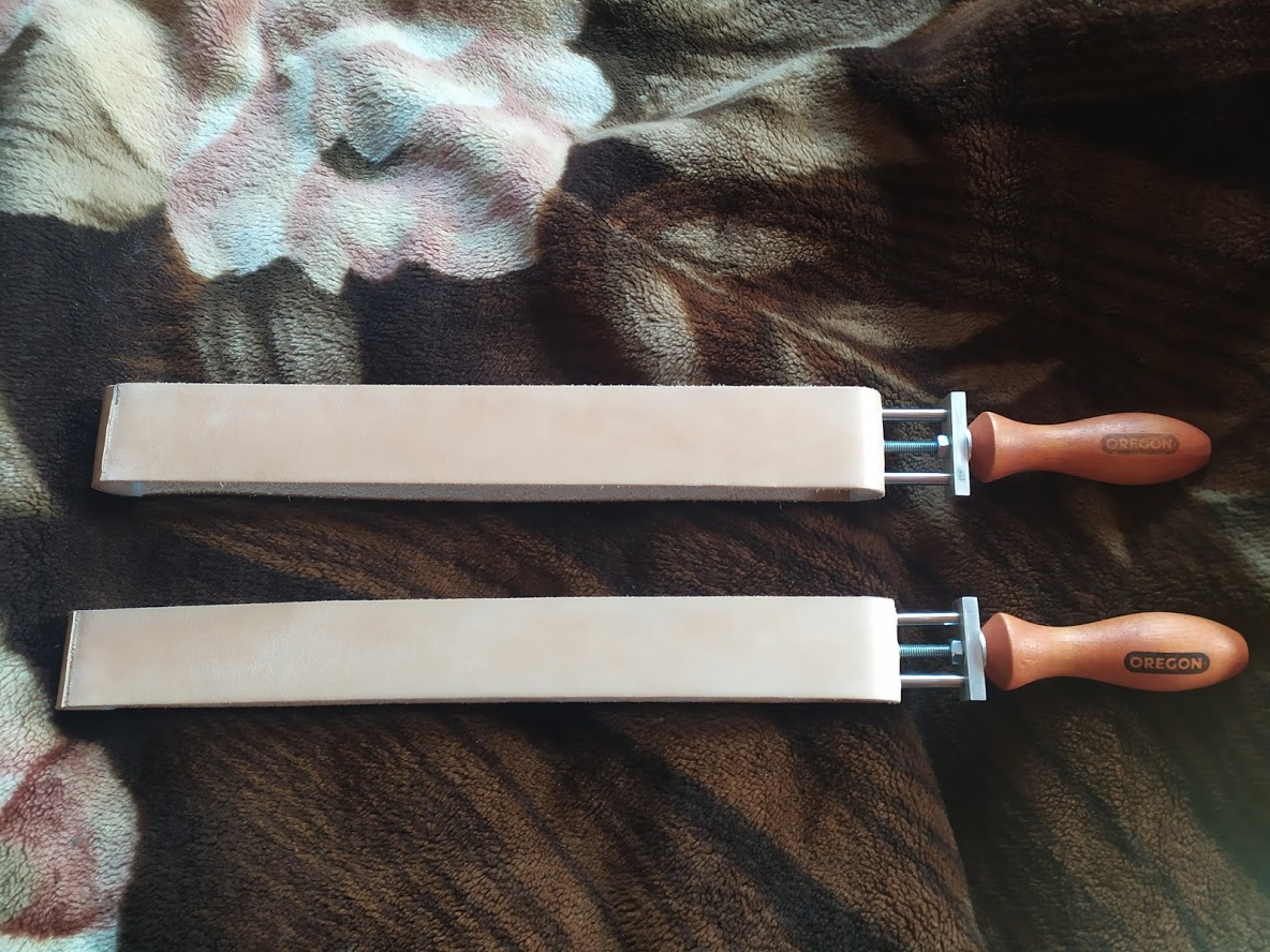 Продам натяжные ремни для правки. Длина ремней 35см, ширина одного 40мм, другого 45мм. Цена 3200р и 3500р соответственно. Направляющие нержавейка, полуролики из капролона (+ в натяжном латунная втулка, где ходит резьбовая шпилька), упорная планка направляющих дюраль, ручка из бразильского ореха (так заявлено в описании, ручка покупная). Кожа использована итальянская растительного дубления, обработана по методике Касуке Ивасаки. Возможна отправка почтой или СДЭКом за счет покупателя. По желанию могу нанести на одну сторону ремня красный Dialux.