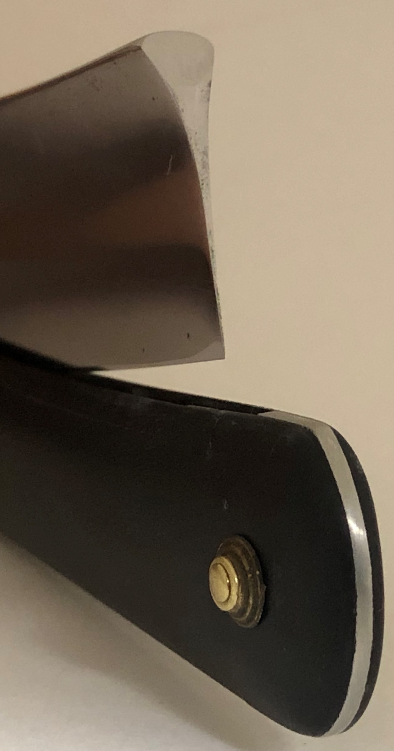 WADE&BUTCHER размером в 7/8 и полной вогнутостью. Никогда у меня не было такой крупной бритвы , с такой вогнутостью.Изящная,с аккуратным и тонком сведением, но в тоже время мощная и серьезная. Полотно на первом этапе было подготовлено методом ручной шлифовки на грубых камнях,с переходом на более тонкие абразивы,до 800 поперечной риски.Никакой патины на эрле в этот раз. Ещё раз отдельное спасибо нашему комраду Алексею Белякову за приведение оригинальной роговой ручки в идеальное состояние.Одна родная плашка была зашпаклевана и отполирована, а вторая, которая пришла разгрызанной ,была заменена на идентичную, того периода,с рифленой структурой материала.В итоге получилась совершенно оригинальная оправа, с одинаковыми плашками, как по структуре, так и по размеру.Родные пины были сохранены и заново установлены. До...