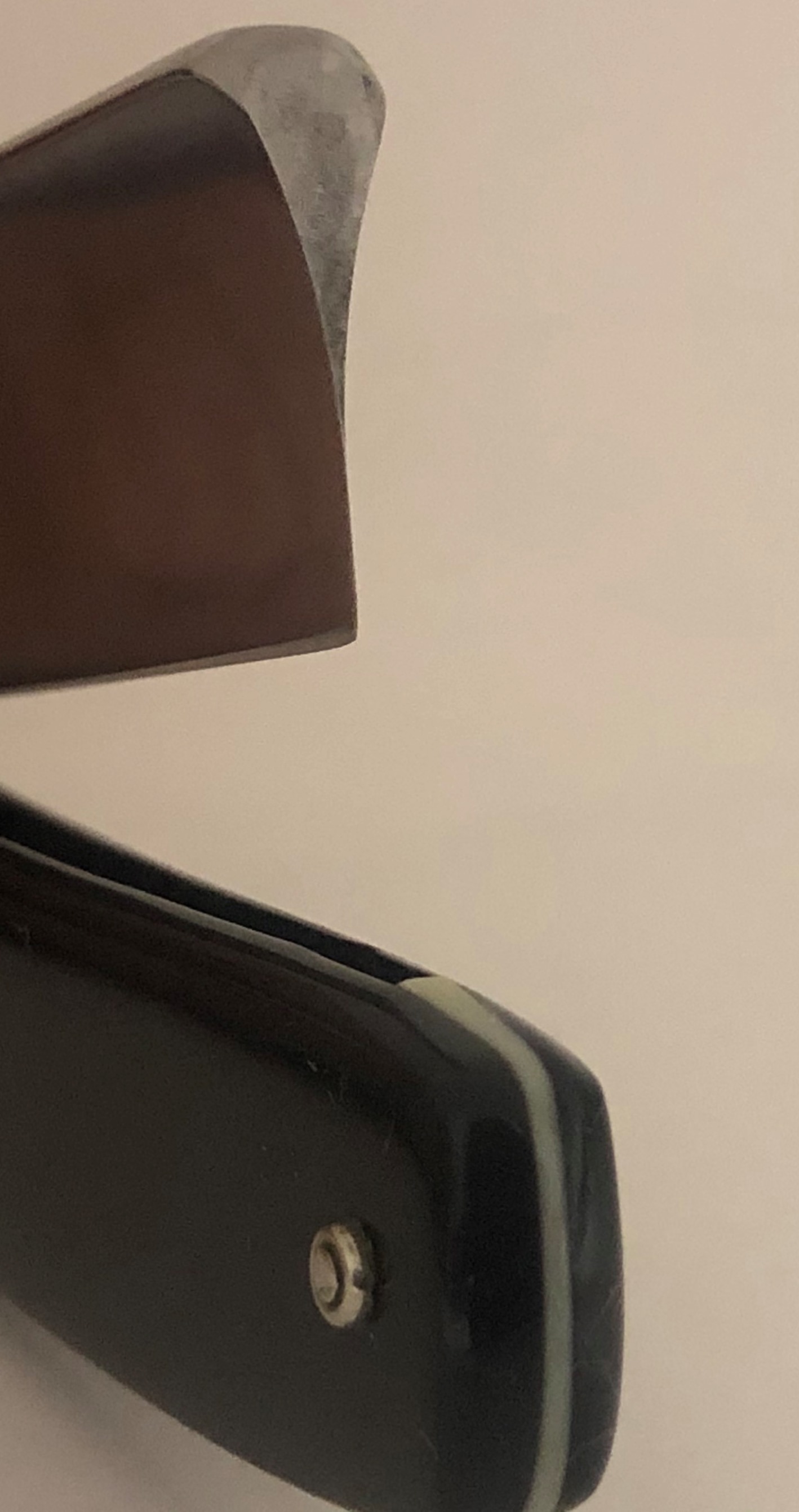 Ширина полотна-20 мм Толщина обушка-5 мм Полная вогнутость. Углеродистая сталь. По косвенным признакам бритва , по всей видимости конца 19-го, начала 20-го века. Клинок был почищен,без применения тяжёлой техники, способной снять много"мяса" и радикально изменить форму лезвия. Ромбовидный обушок.Бритва хоть и немного пользованная, но совершенно не уточена и находится в очень хорошем состоянии.Сталь чистая,без видимых дефектов.Мощная, крупная пластиковая оправа от английского донора начала 20-го столетия.Пины-немецкие двух-цветные втулки, с добавлением внутренних шайб.По своей форме лезвия и размеру бритва может представлять идеальный и недорогой вариант прежде всего для новичка. После продажи будет заточена и подготовлена к бритью. По желанию будет лично мной протестирована. В общем и целом очень приятная во всех отношениях бритва. Цена-5500 р с заточкой и доставкой. [/b][/QUOTE] ПРОДАН Внимание! Важная информация! Spoiler Show