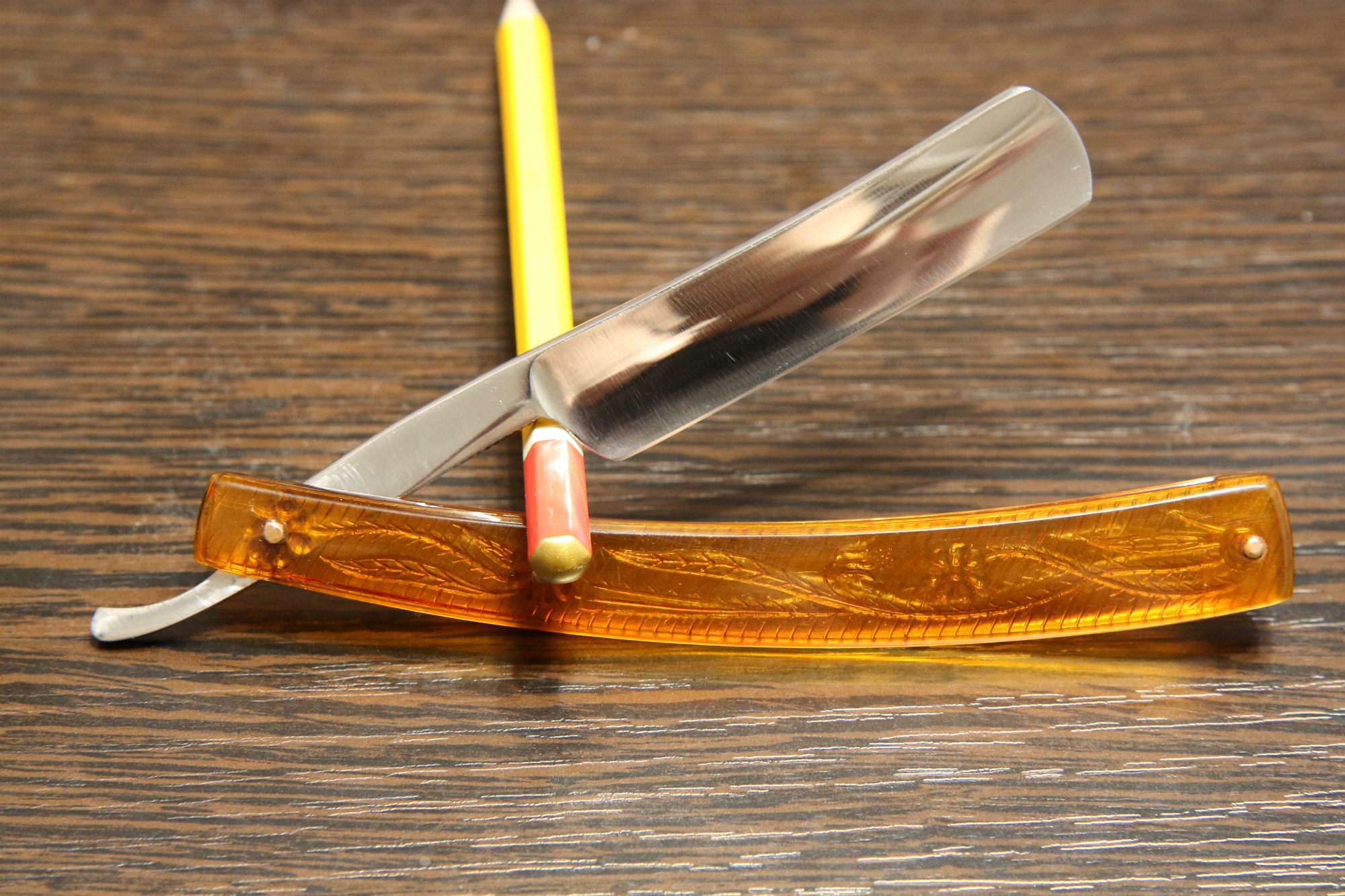 Опасная бритва завода Труд Вача Росинструмент, 1941 г, 8 месяц. Смоленское сражение, осада Одессы, оборона Киева, немец нацелен на Москву, и штурм Ленинграда... Ширина полотна 17.7 мм, все родное, футляр тоже. Ручка родная, из полупрозрачного пластика с узорами, трехпиновая. Бритва пришла с заводской заточкой и в идеале, чуть прошелся пастами и заточил. Подготовлена мной к бритью. Бритвы с клеймом "Росинструмент" очень ценятся. На мой вкус бреет достойно, без агрессии. Цена - руб.