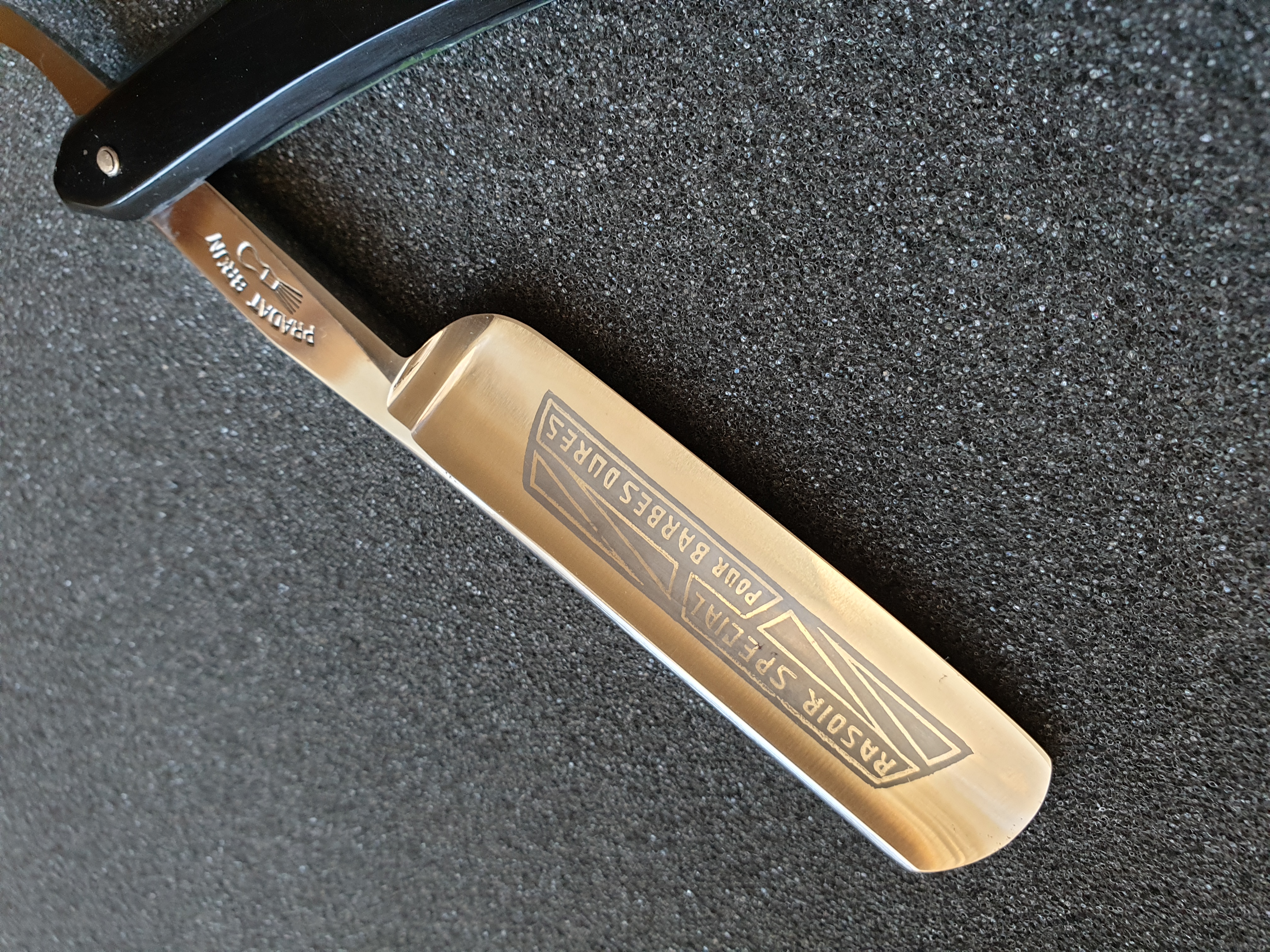 Продаётся от S&T81. Франция, винтажный Pradat Brun в непользованом состоянии, родные заводские кондиции без посторонних шлифовок-полировок, сделана первая заточка на японских камнях, которая показала идеальную геометрию клинка с тонкой и ровной рабочей кромкой. Клинок паркуется в ручку ровно, без перекосов и закусываний. Рекламное травление на клинке сообщает о бритве "специально для жесткой щетины".