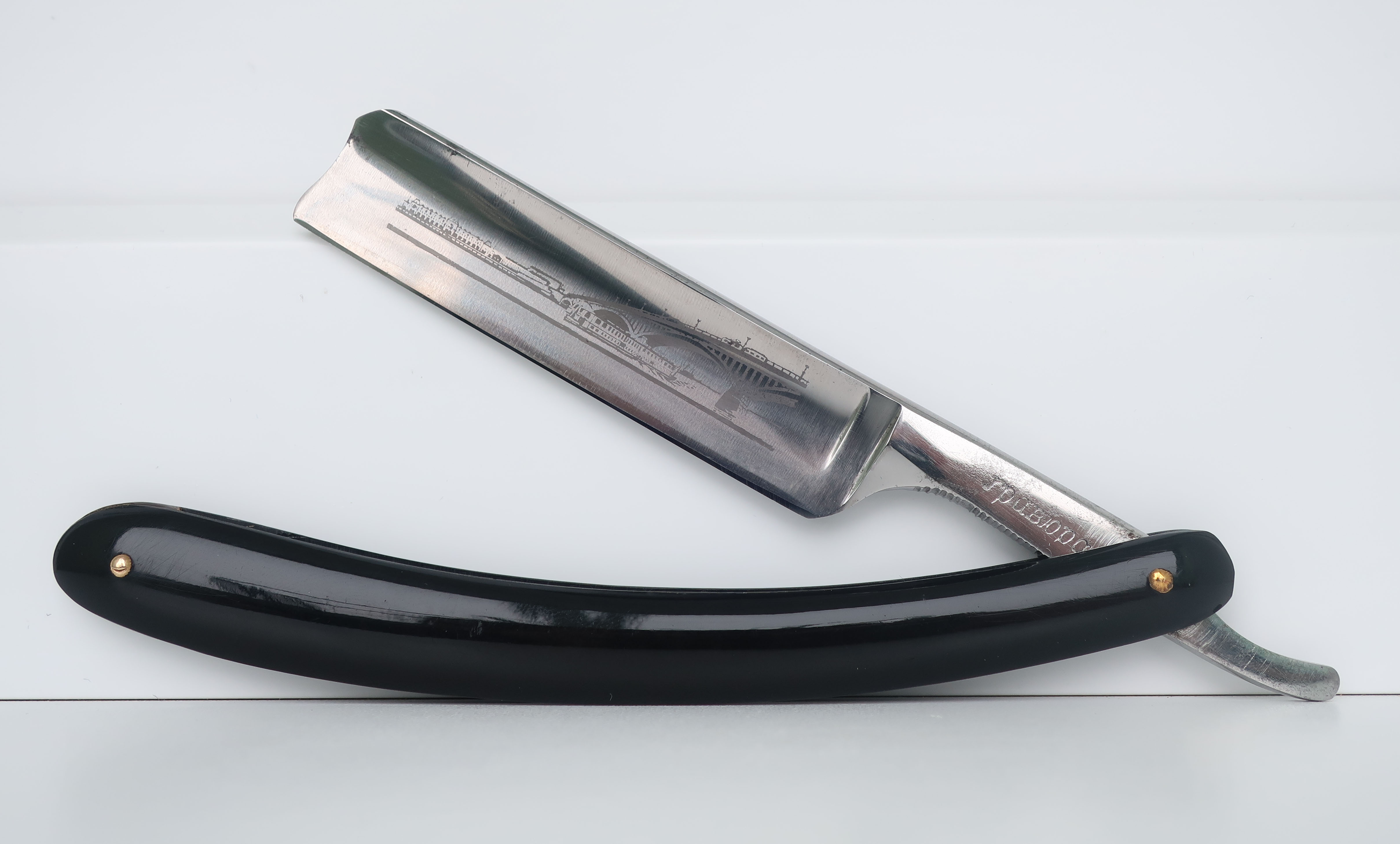 ЗТВ Подарок 56 г. Сюжет "Миру мир!", не частая бритва, барберский нос. Пришла в равномерной черной патине на всем полотне, и местами более серьезной коррозией, при таком раскладе всегда дилемма - почистить полностью и счистить гравюру или сохранить, при этом оставив где то следы или остатки. Считаю, что если гравюра повреждена безвозвратно, то счистить. Если можно как то сохранить, то это нужно сделать, без гравюры бритва теряет свою фишку. Чистил вручную, аккуратно, что то осталось по мелочи, но на мой вкус - не критично. Так же сохранил позолоту на обушке и носе