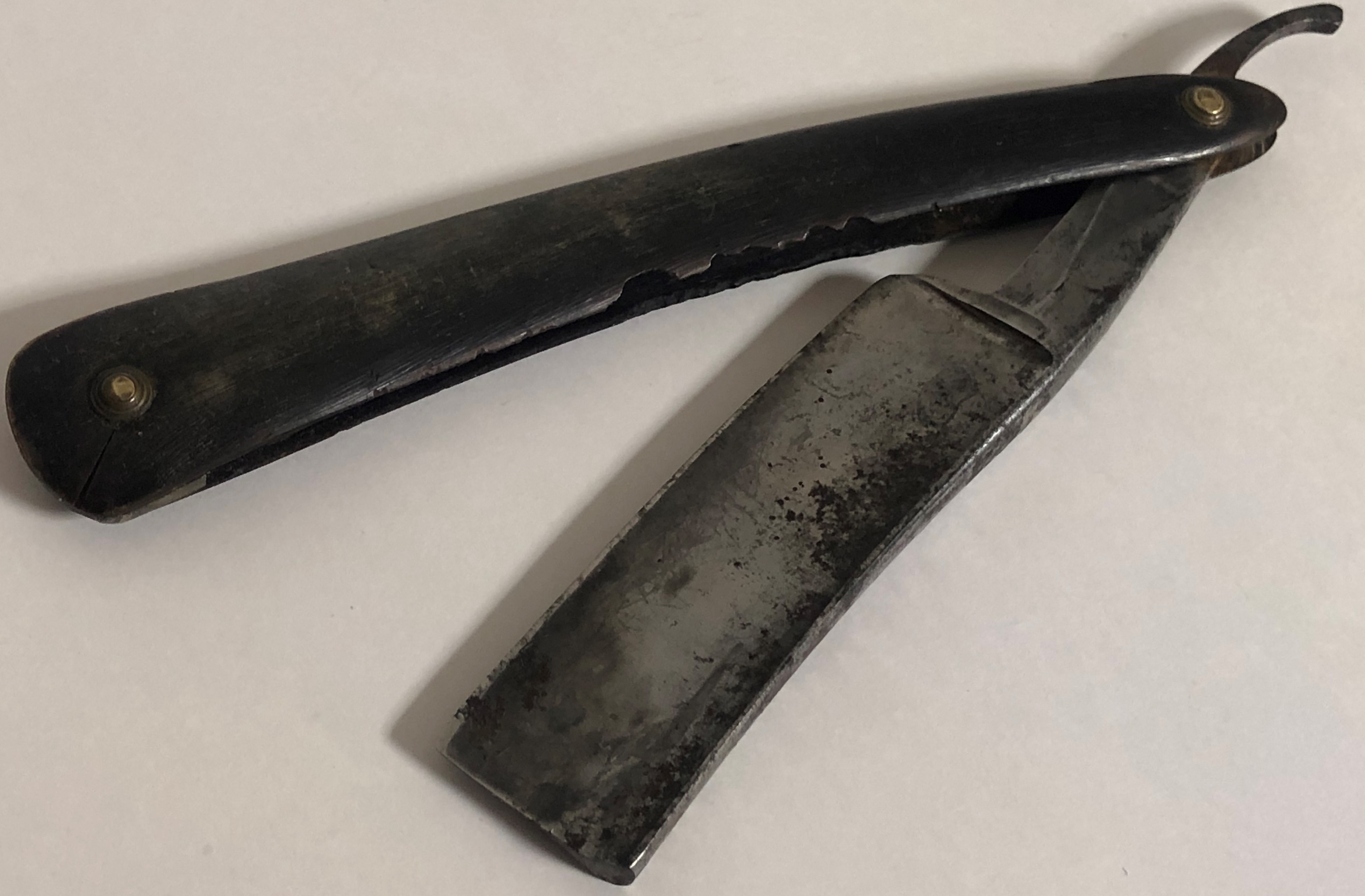 WADE&BUTCHER размером в 7/8 и полной вогнутостью. Никогда у меня не было такой крупной бритвы , с такой вогнутостью.Изящная,с аккуратным и тонком сведением, но в тоже время мощная и серьезная. Полотно на первом этапе было подготовлено методом ручной шлифовки на грубых камнях,с переходом на более тонкие абразивы,до 800 поперечной риски.Никакой патины на эрле в этот раз. Ещё раз отдельное спасибо нашему комраду Алексею Белякову за приведение оригинальной роговой ручки в идеальное состояние.Одна родная плашка была зашпаклевана и отполирована, а вторая, которая пришла разгрызанной ,была заменена на идентичную, того периода,с рифленой структурой материала.В итоге получилась совершенно оригинальная оправа, с одинаковыми плашками, как по структуре, так и по размеру.Родные пины были сохранены и заново установлены. До...