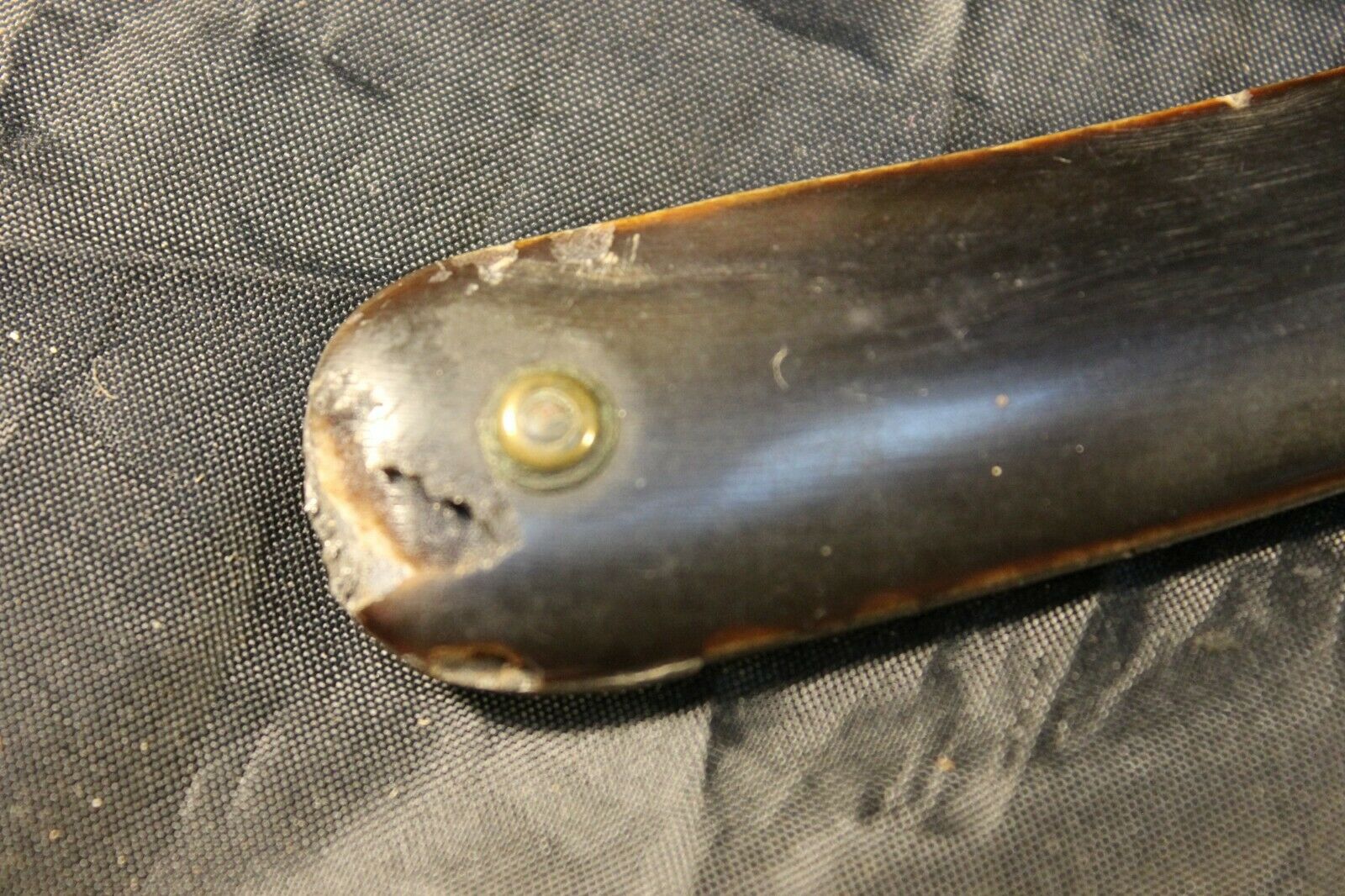 восстановление ручки по принципу наращивания. берешь плашку рога аналогичного по цвету, на надфиле измельчаешь его, добавляешь в эту стружку каплю-две колоранта (пигментный концентрат), смешиваешь, пока вся стружка не будет однородно-черной, для темно коричневой надо подбирать соответствующий колорант, даешь высохнуть немного этой стружке (на солнце-батарее это достигается быстро). потом, буквально, по грамулечке подсыпаешь в пустоту на ручке и капаешь сверху цианокрилат (клей момент лучше своим относительно нормальным дозатором) и так по немножечку-помаленечку наращиваешь с небольшой горкой, которую потом сошлифовываешь 120 наждачкой, а потом уже по проекции вверх, которая тебе надо. на деле очень такой творческий процесс. на примере ручки выше.. я ненавижу, когда 150-200 летние ручки полируют на станке, что рог плывет в леденец, так не делали раньше, почему сейчас это так распространено - не знаю. вообщем, у рога есть структура... у рога выше она явно выражена, клей со стружкой же, когда его шлифуешь, выглядит однородно, по-этому, соответственно, 120 наждачку, я пытался нанести по направлению, в котором расположены "прожилки"... и потом эту 120-ку не выводил, а всего лишь приаккуратил 400-ой и вручную отполировал. немного небрежности для антуража и получается под стать клинку.