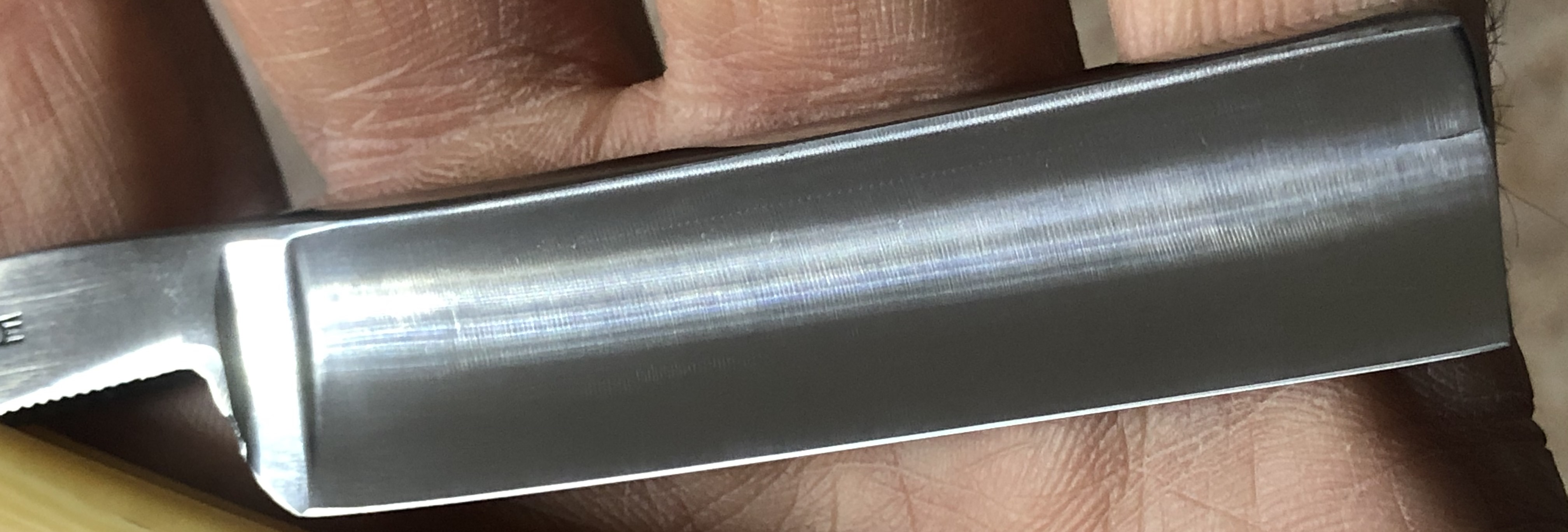 Бритва очень хорошо сохранилась, без критичных дефектов и наверное малопользованная, судя по неуточенному обушку..Была разобрана, немного почищена , отполирована и снова собрана, с сохранением родного пина. Кромочка идеально ровная.(Немного уточен носик, в результате неправильно заточки предыдущими владельцами. Но, практически незаметно и ни на что влиять не будет.)Приятная бритовка во всех отношениях. Будет удобна не только в качестве бритья, но и для коррекции усов и бороды.Не пропустите отличную вещь, за недорого, практически по цене советской.