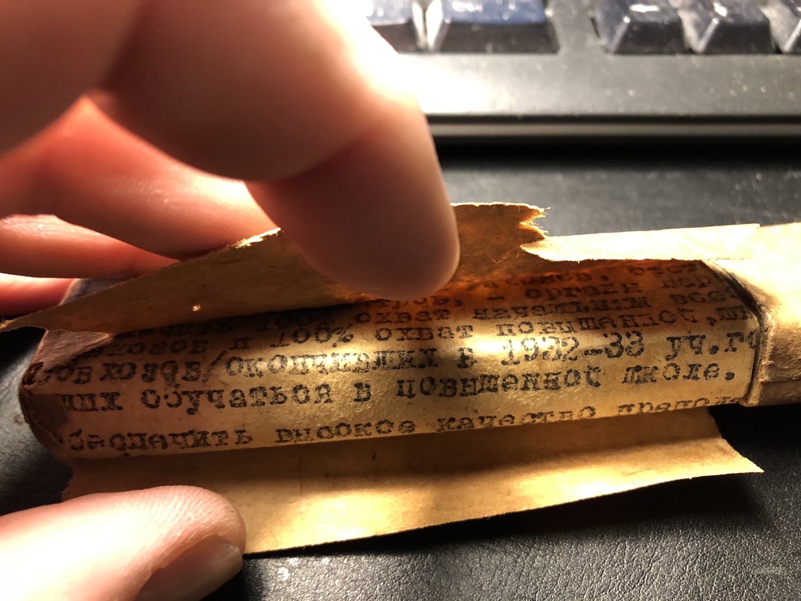 коробочка была надорвана, часть обложки отклеилась. Под ней обнаружена часть листа с тексом и упоминание про 1932-1933 учебный год.