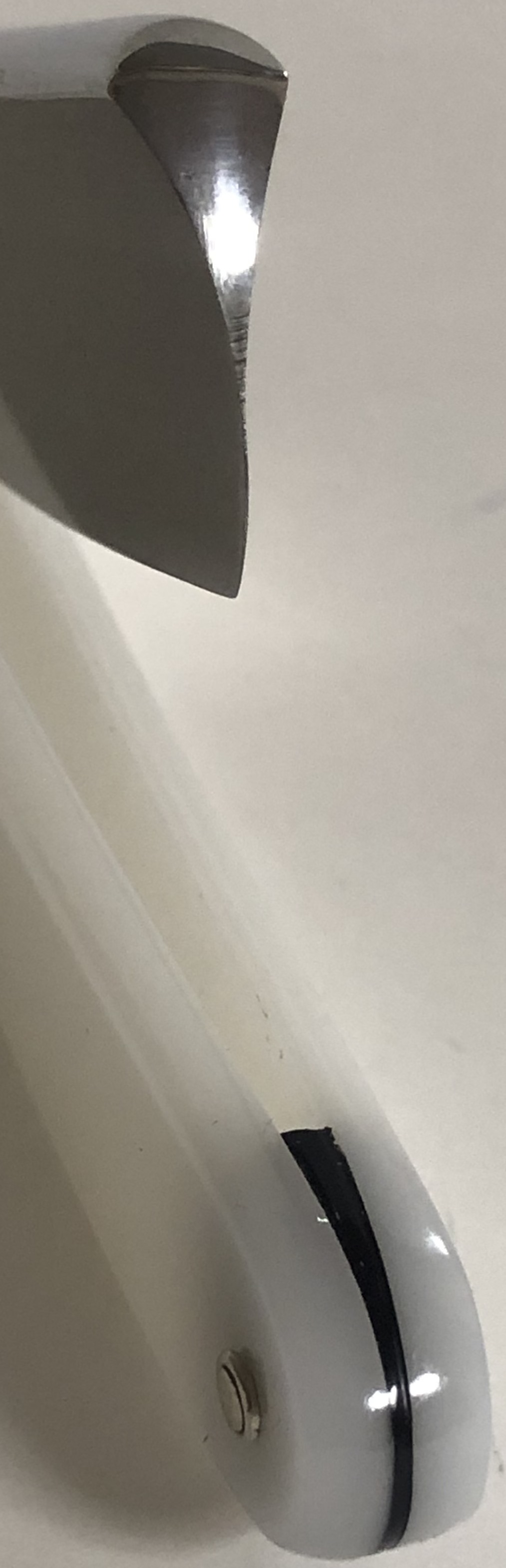 Бритва очень хорошо сохранилась, без критичных дефектов и наверное малопользованная, судя по неуточенному обушку..Была разобрана, немного почищена , отполирована и снова собрана, с сохранением родного пина. Кромочка идеально ровная.(Немного уточен носик, в результате неправильно заточки предыдущими владельцами. Но, практически незаметно и ни на что влиять не будет.)Приятная бритовка во всех отношениях. Будет удобна не только в качестве бритья, но и для коррекции усов и бороды.Не пропустите отличную вещь, за недорого, практически по цене советской.