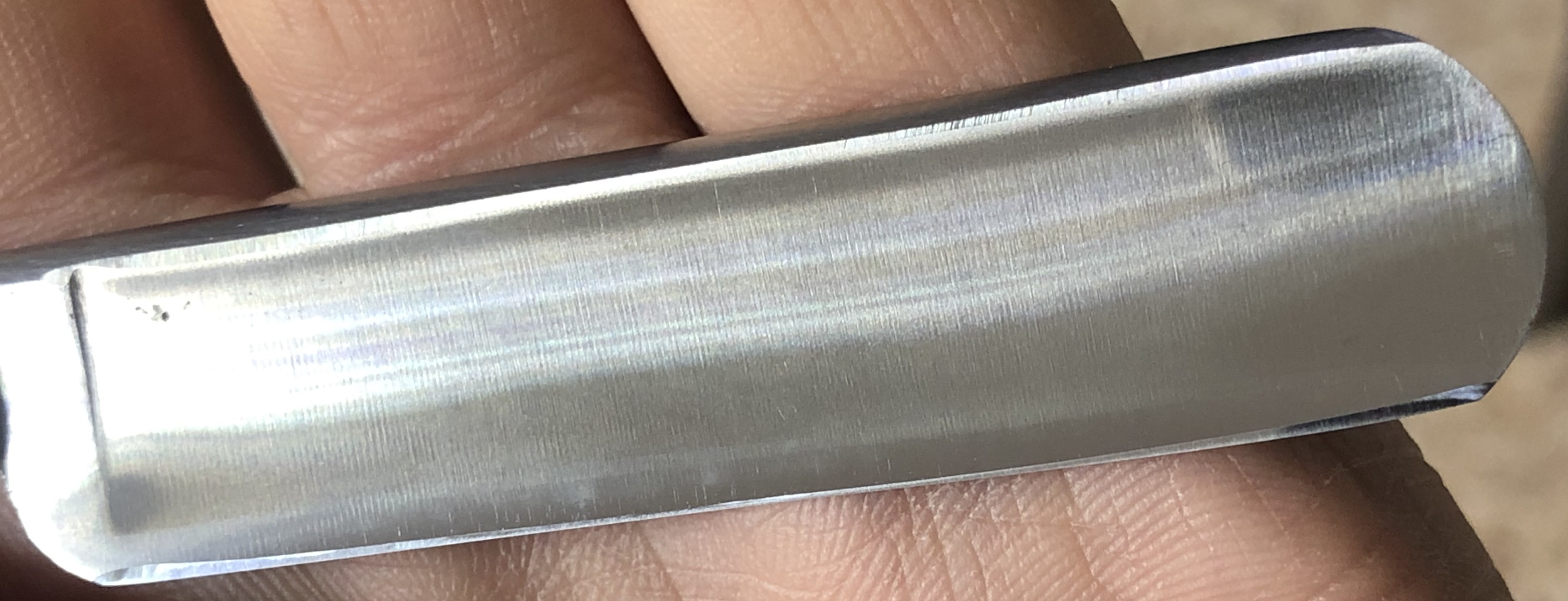 Бритва пользованная, но в очень хорошем состоянии.Аккуратное использование.Была разобрана, немного почищена и снова собрана,с сохранением оригинальных пинов.Сталь и кромка чистые, без видимых проблем.Идеальная геометрия клинка:кромочка равномерна по всей длине.