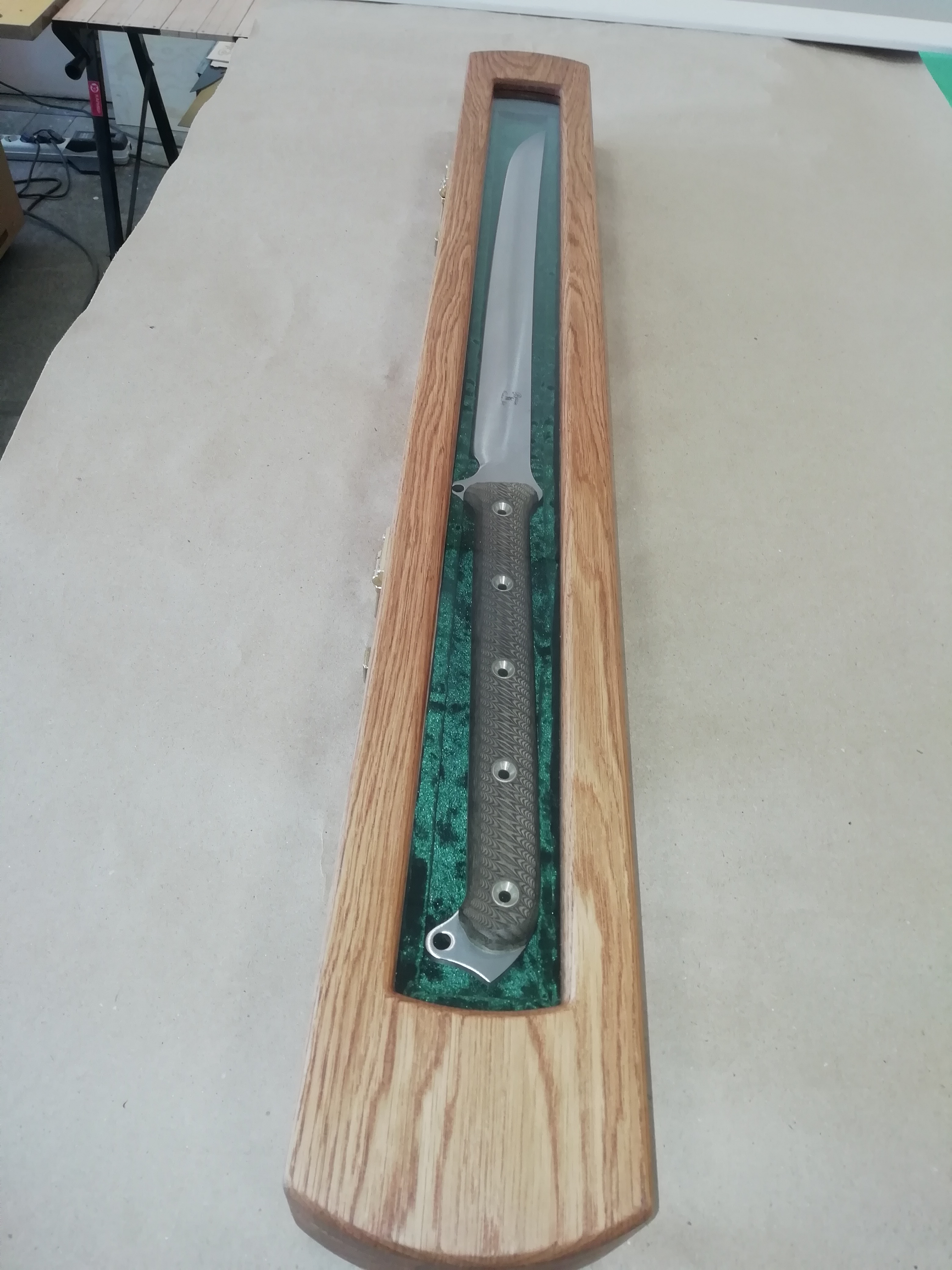 Ну вот футлярчик для не совсем бритвы, но тоже острая вещь - для Busse Combat American Kensei 47 (AK-47) Wakizashi, 2005. Явное ХО. Азотировано-ванадиевая сталь INFI (клинок сгибается вбок до 35 град без повреждений, при 58...60HRC!), длина шашечки\сабельки\ножичка - 29" (74см, ну прям длинная для меня). В общем это один из шедевров УСАшных ножеделов от уважаемого производителя. И потому, как я понимаю, это чистый вечный полочник. Потому и футлярчик делал очень внимательно, старался, чтоб он коррелировал с помещаемым внутрь предметом. Материал - дуб склейка с покрывными ламелями - 40мм толщины. 920 х 110 х 69 мм - габариты футляра. ТикОйл, Воск затемнённый Либерон, китайская и итальянская латунная фурнитура, зелёный бархат, поролон ППЭ, ППУ, стекло - акрил (Плексиглас), неодимовые магниты, фетр. Общий вес футлярки около 5...6кг, если с ножиком, в общем тяжёлый, как камрад захотел. Сабелька держится внутри футляра на 3х прямоугольных магнитиках, при их общем усилии около 10кг. (или более), что позволяет, в том числе, переносить футляр с зафиксированной ими шашкой-вакидзашкой внутри (и даже трясти футляр). Футляр стоит на 5 ножках 7х16х50 R6 мм, которые врезал на 3 мм в выборки корпуса, снизу ножек - фетр. Выношу на ваш суд, соответствует ли исполнение задаче (любое мнение интересно)?