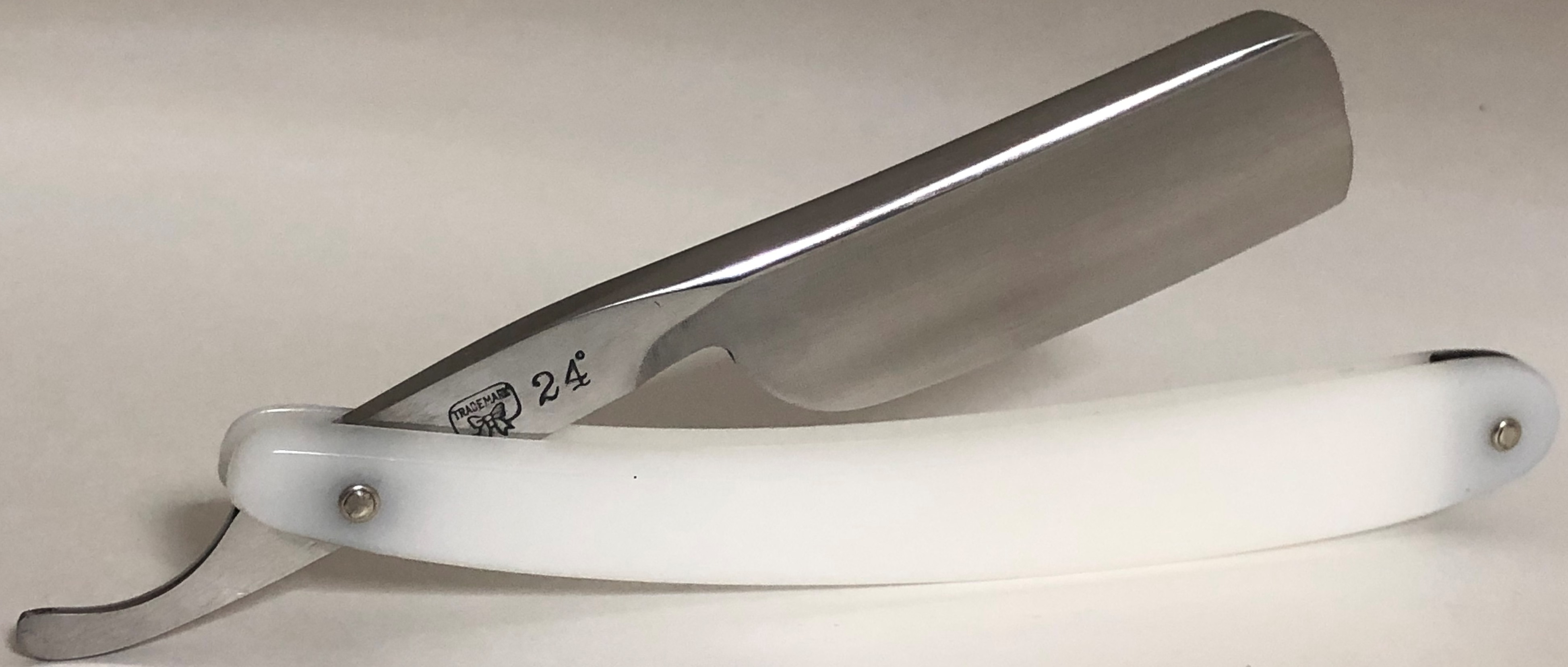 Бритва в очень хорошем состоянии, с минимальными следами использования.Не разбиралась.Оригинальные пины и оправа.Полотно было немного почищено от следов времени и умеренно отполировано.Кромочка равномерна по всей длине.Идеальная геометрия.Сталь и кромка чистые, без видимых дефектов.Тяжёлый, мощный,среднего размера клинок,будет очень кстати тем, кому не по душе дюймовая классика, но есть желание попробовать клин в деле.Заточена и готова к бритью.
