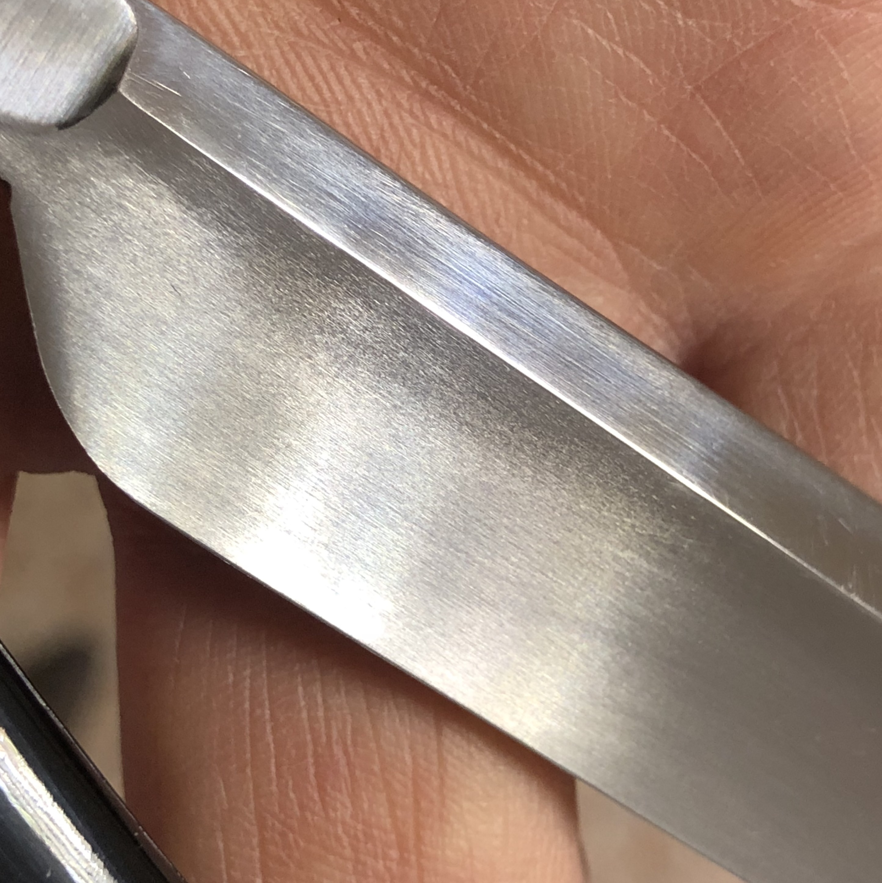 Бритва пользованная, но в очень хорошем состоянии.Аккуратное использование.Была разобрана, немного почищена и снова собрана,с сохранением оригинальных пинов.Сталь и кромка чистые, без видимых проблем.Идеальная геометрия клинка:кромочка равномерна по всей длине.