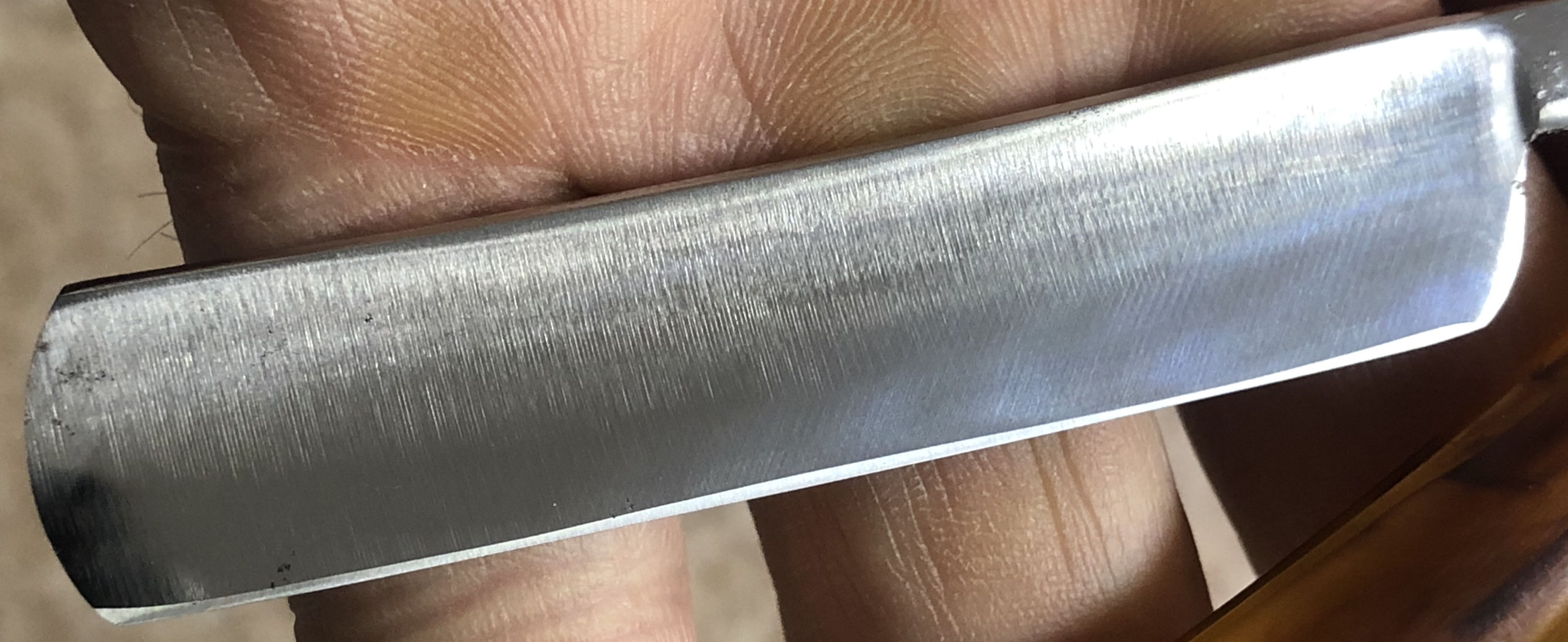 Бритва пользованная, но в очень хорошем состоянии.Аккуратное использование.Была разобрана, немного почищена и снова собрана,с сохранением оригинальных пинов.Сталь и кромка чистые, без видимых проблем.Идеальная геометрия клинка:кромочка равномерна по всей длине.