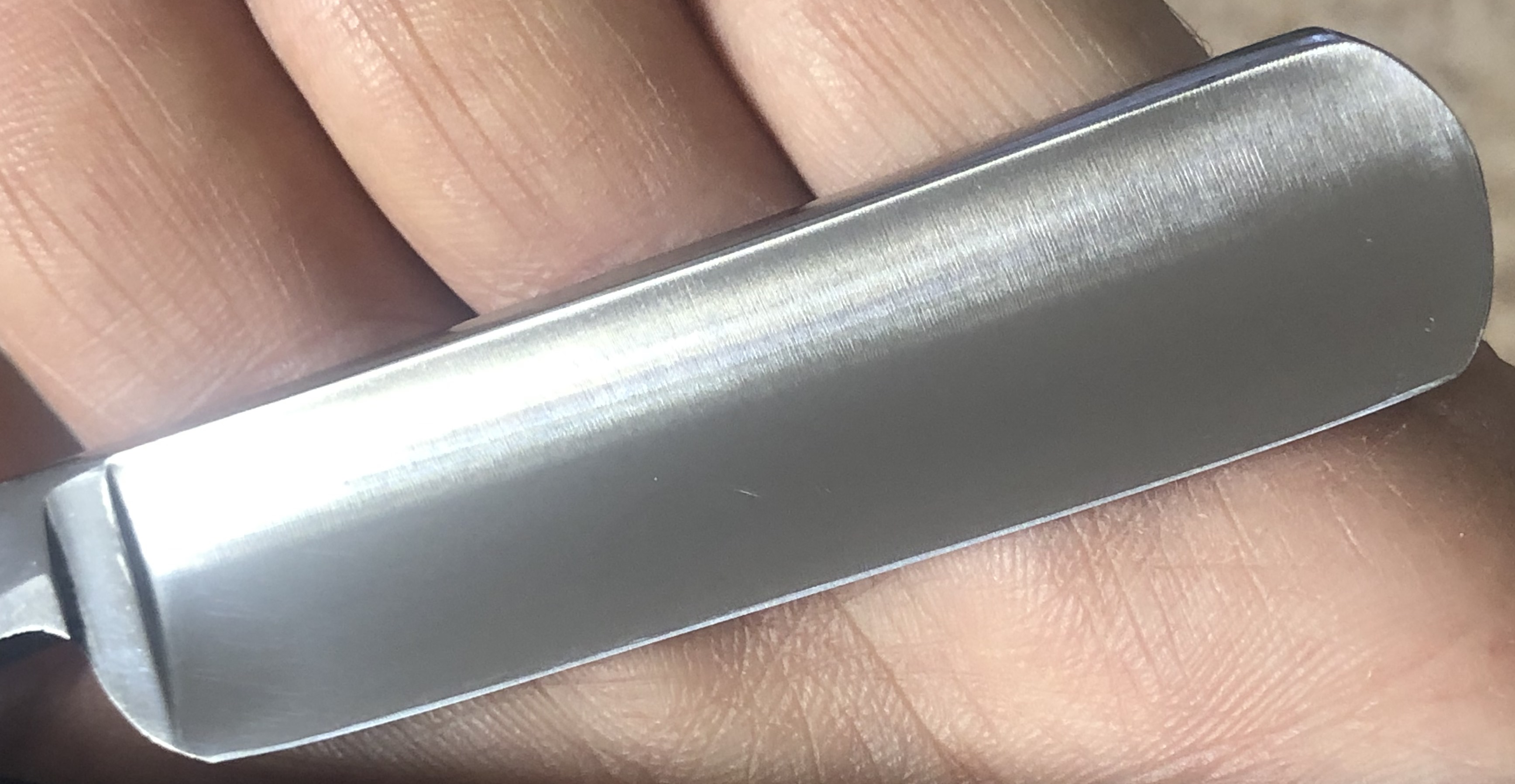 Бритва очень хорошо сохранилась, без критичных дефектов и наверное малопользованная, судя по неуточенному обушку..Была разобрана, немного почищена , отполирована и снова собрана, с сохранением родного пина. Кромочка идеально ровная.(Немного уточен носик, в результате неправильно заточки предыдущими владельцами. Но, практически незаметно и ни на что влиять не будет.)Приятная бритовка во всех отношениях. Будет удобна не только в качестве бритья, но и для коррекции усов и бороды.Не пропустите отличную вещь, за недорого, практически по цене советской.