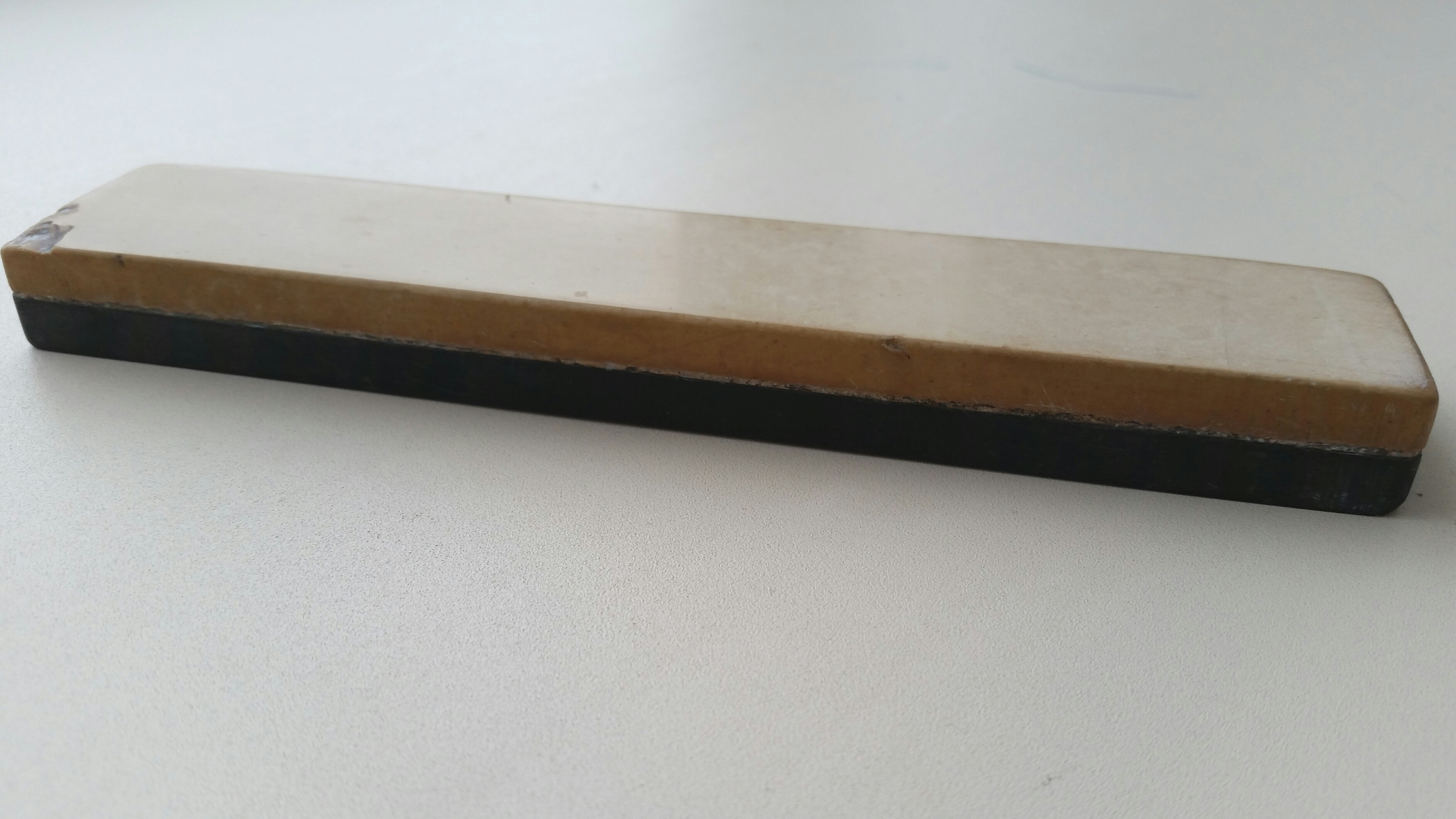 Бельгийский котикул, наклеен на слой какого то сланца, возможно ББВ. Попал ко мне от внука человека, который пользовался им с 40х годов в Союзе, ему видимо достался как трофей с ВОВ (а может и нет))). Камень с двух сторон мной был выровнен и подготовлен на порошках КК до F800, так же желтый слой протестирован по бритвам - выдает как и подобные котикулы, где то до 8000, довольно быстрый, может даже подойти на финиш бритвы при определенной методике доводки (но я не пробовал, просто предположение), а так это отличный предфиниш (или финиш качественных ножей), могу отнести к очень твердым сортам, сопоставим с лучшими арканзасами транслюцентами. Темный сланцевый слой я не тестил, предлагаю новому владельцу самому раскрыть его возможности, на нем, кстати, тоже работали и немало, по ощущениям и виду, похож на наши сыростанские сланцы, которые выдают около 4000 грит. Размеры камня 177х34х15 мм (стандартный 7 дюймовый размерчик, очень удобнен), желтый слой толстый и хватит его еще на вагон бритв - 7 мм. Бритва лежит для масштаба и с камнем не продается. Цена - руб.