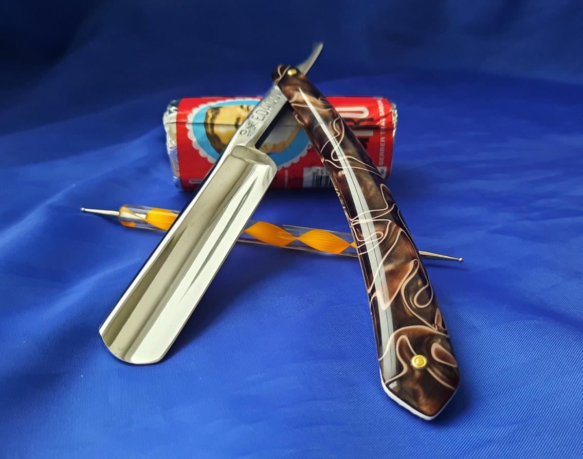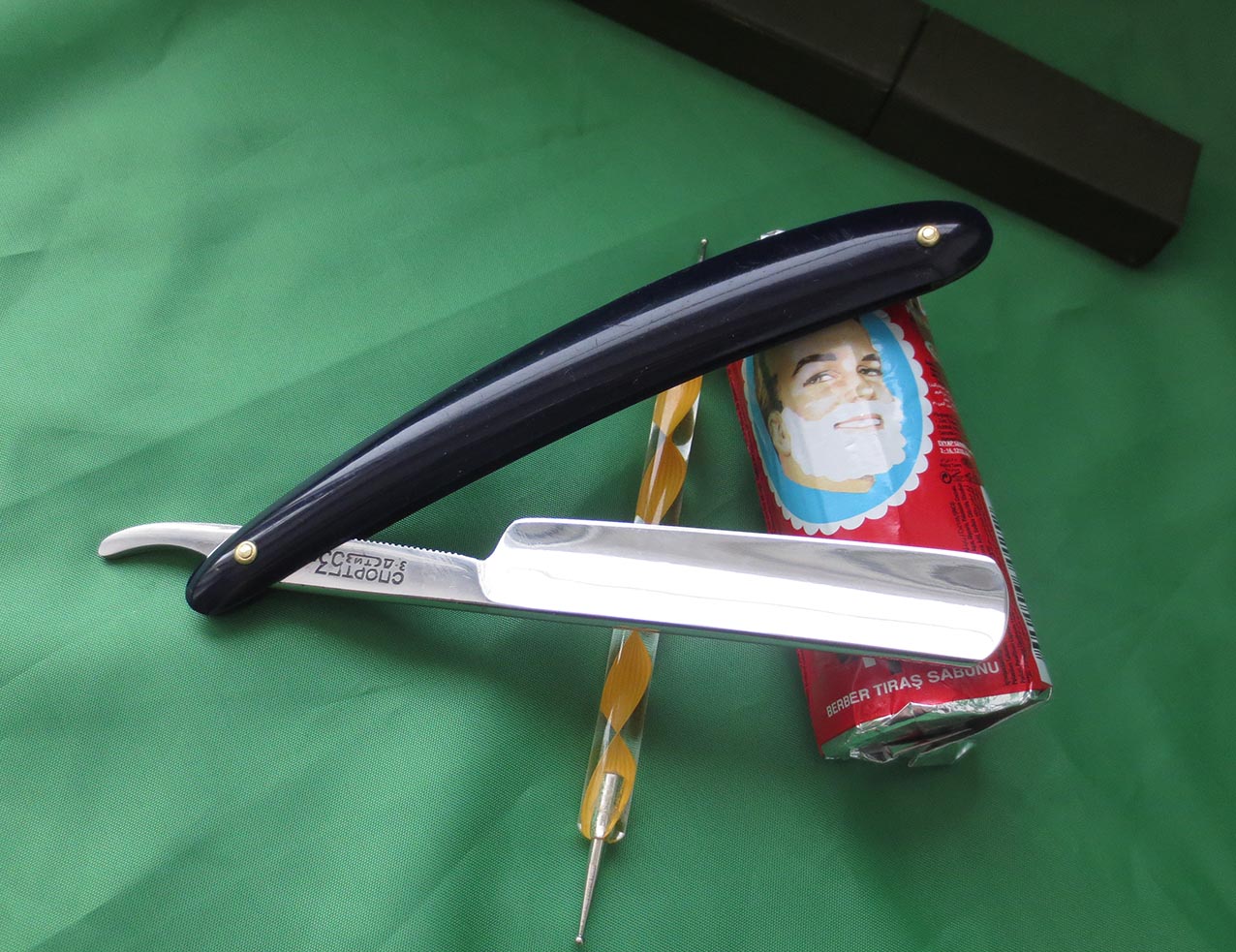 Ориентировочно - 50-60 годы, углеродистая сталь, ширина клинка - 6/8 дюйма, заклёпки - латунь. Вместо старой, хотя и годной оправы, была изготовлена новая, из американского киринита цвета "Desert Camo" от чего внешний вид бритвы только выиграл. Инструмент заточен на японских водных камнях, направлен, продезинфицирован и полностью готов к работе сразу после покупки, купил и брейся. Очень достойный вариант не только для новичка, но и для бывалого пользователя. Также всегда в продаже ремни для правки из натуральной полированной кожи растительного дубления и при покупке бритвы и ремня почтовые расходы по России за мой счёт. Начинающим подскажу и покажу, как пользоваться и ухаживать за инструментом. Цена - 8250 рублей.