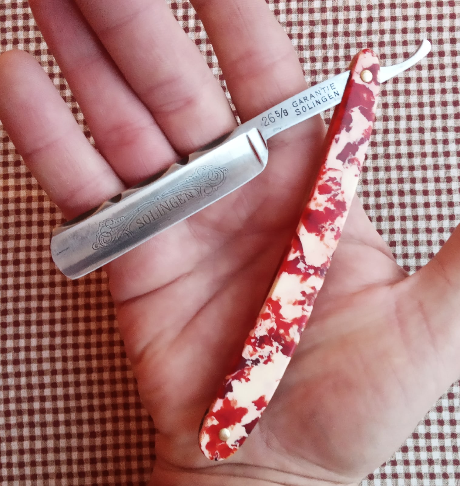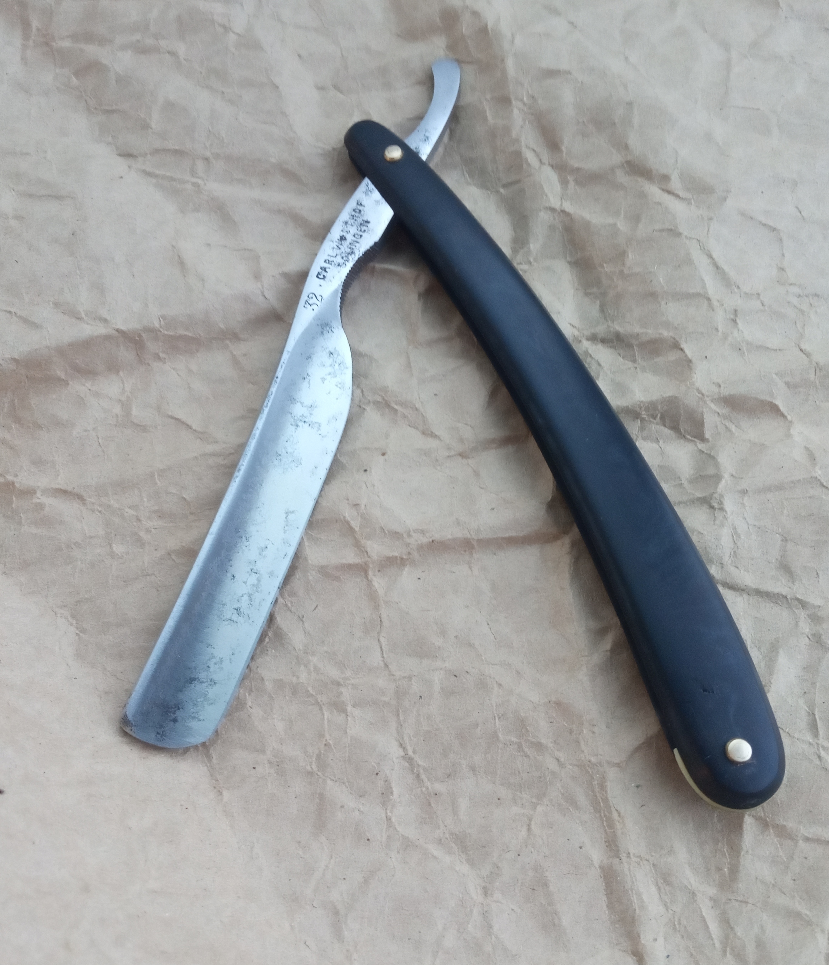 Ориентировочно сделана в первой половине ХХ века. Клинок - 16,5 мм с полной выборкой. Произведён в Германии. Оправа из какого-то пластика тех времён. Не разбиралась. Заточена. Цена: продано