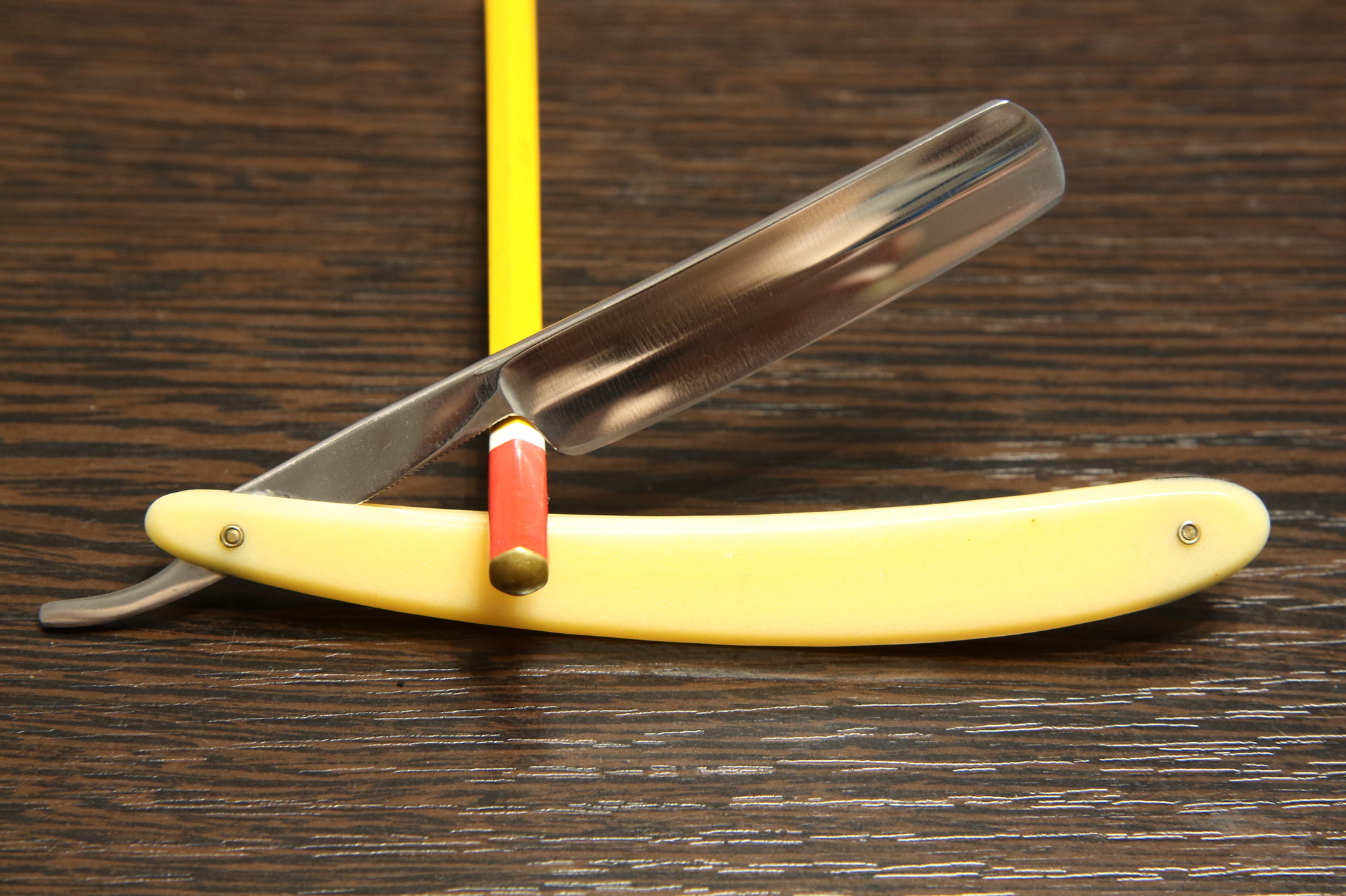 Опасная бритва Dovo Best Quality Solingen, сделана в Германии в г. Золинген, ширина полотна 20.3 мм, ручка трехпиновая из желтоватого пластика, все родное. Ко мне попала с заводской заточкой и без каких либо следов, с гравюрой. Продезинфицировал и подготовил к бритью. Широкая и удобная бритва с традиционной немецкой сталью на полной выборке. Цена - руб.