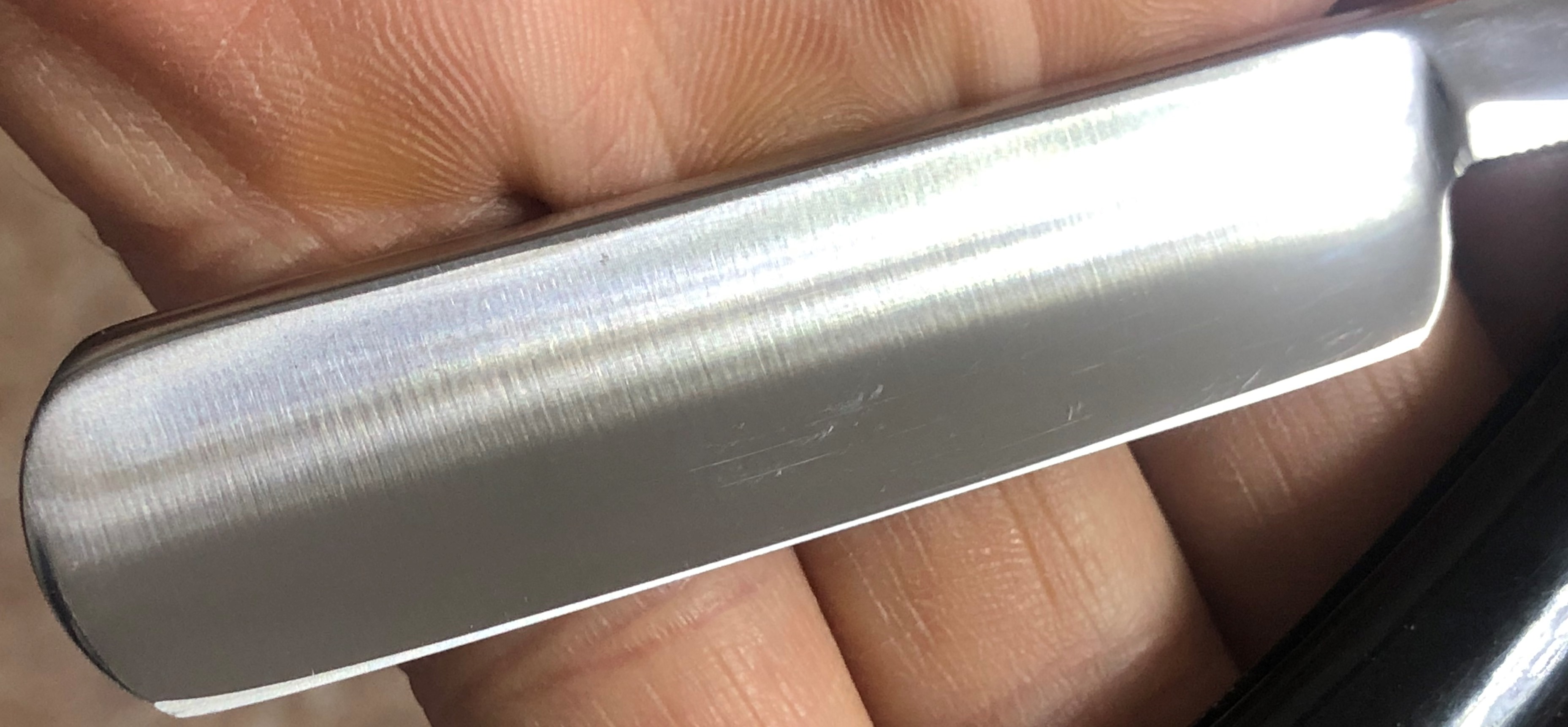 Бритва в идеальном состоянии,без следов пользования.С большой долей вероятности вообще не была ещё в деле.Не разбиралась.Немного освежил клинок от патины, на самых тонких абразивах и полирнул.Состояние новой бритвы.Идеальная геометрия:кромочка равномерна по всей длине.Сталь чистая, без дефектов.