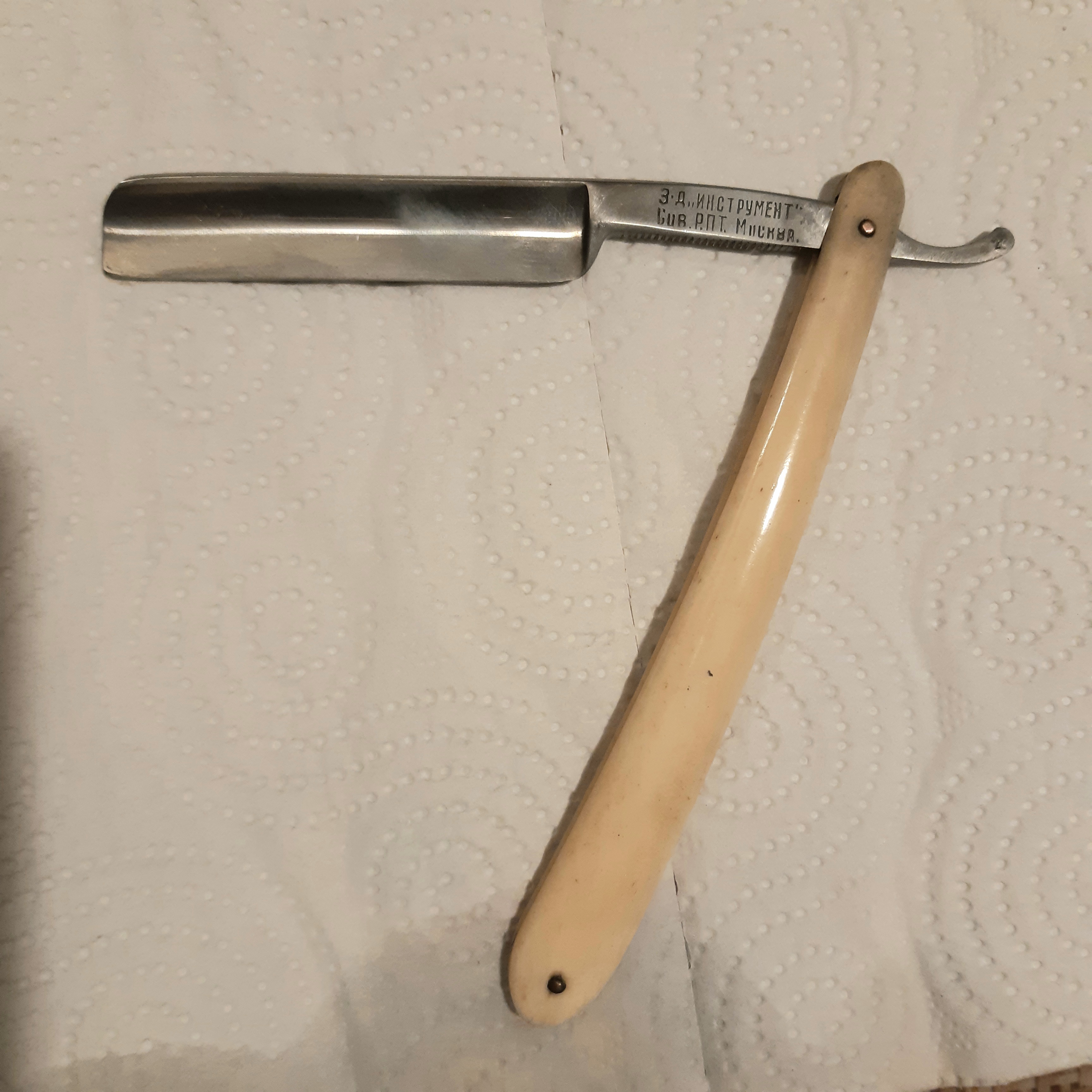 Пока мне в руки не попал "Инструмент".Попал впервые и попал совершенно в непользованном состоянии.Бритву разобрал и немного привел в порядок.Что интересно, сама форма лезвия совершенно не схожа ни с одной советской бритвой. Больше напоминает что то от немецкого производителя. Но главное, это вес клинка.Клинок действительно тяжелый, массивный и с идеальной геометрией.Наверное самый тяжёлый клинок из всех советских. А тут еще родная оправа из натуральной кости. На сколько мне не изменяет память, то ручки из кости делали ещё 2 ГПЗ.Больше не припомню.Единственно что смутило, это достаточно толстые и неэластичные плашки, что не дает возможность хорошо отрегулировать осевой механизм. Но, в моём случае все получилось и клинок " не проскальзывает".Ну и наверное самая важная вещь, это качество стали.Я сужу с точки зрения заточника, и если бы не знал, что это бритва советского производства, то подумал бы, что точу иномарку высокого качества. Заточка идеальная, тест на рез волоса проходит мягко, как и положено. Ну и естественно бритье. Когда ещё предоставится возможность лично протестировать такую вещь. Вот чего ожидал от советской бритвы, это фирменный "металлический" характер сбриваемой щетины. Тут такого нет. Ощущение, что просто снимаешь пену с лица. После бритья тест на рез волоса, без правки на ремне. Вот совершенно согласен с Олег Бритва, что этот "Инструмент" наиболее удачный из всего того, что выпускалось у нас в прошлые годы. Короче, умели делать у нас бритвы тоже..