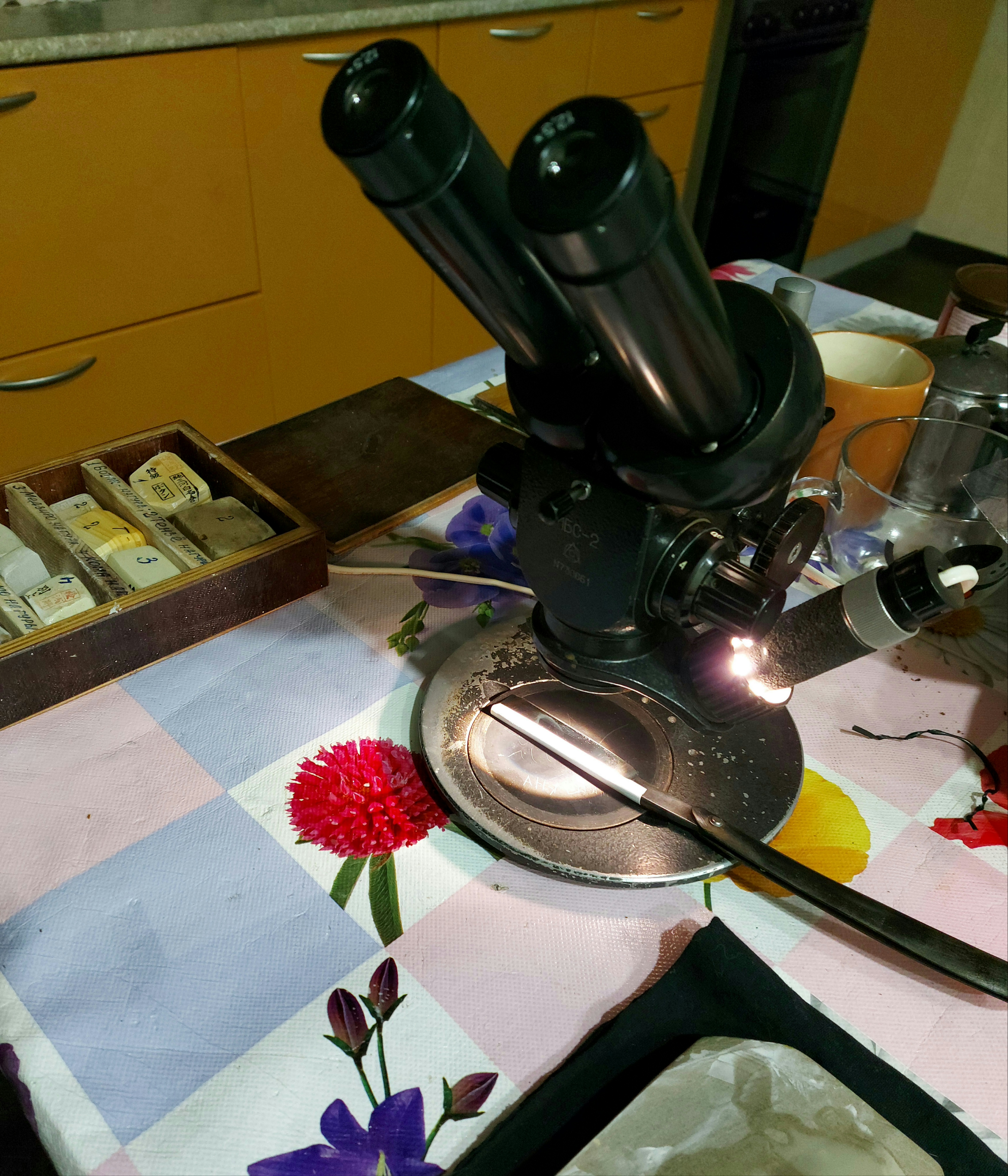 Оптика в помощь заточнику (лупы. микроскопы).Уважаемые форумчане, я тоже много лет затачивал, используя в основном только китайскую лупу с подсветкой 40х. Лежит и Kenko, которым почти не пользовался. Почему то от него болят глаза. Но никогда не говори никогда. По случаю, за недорого приобрел старенький советский МБС-2.