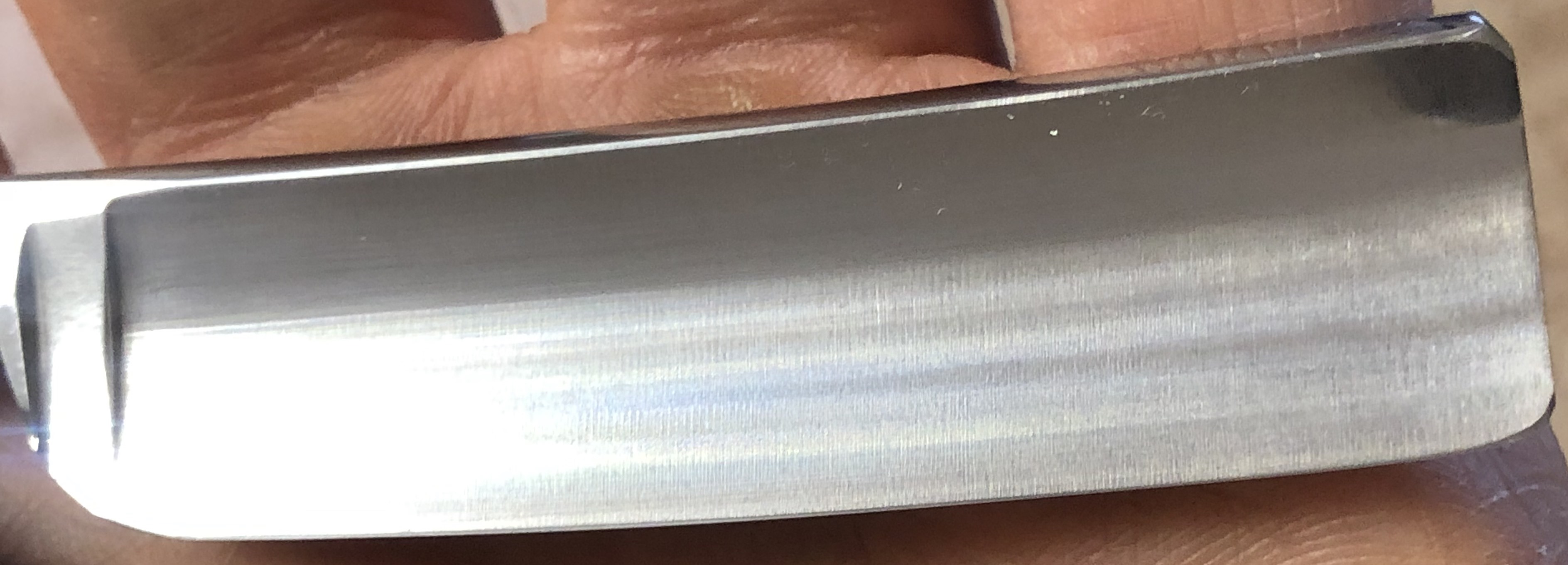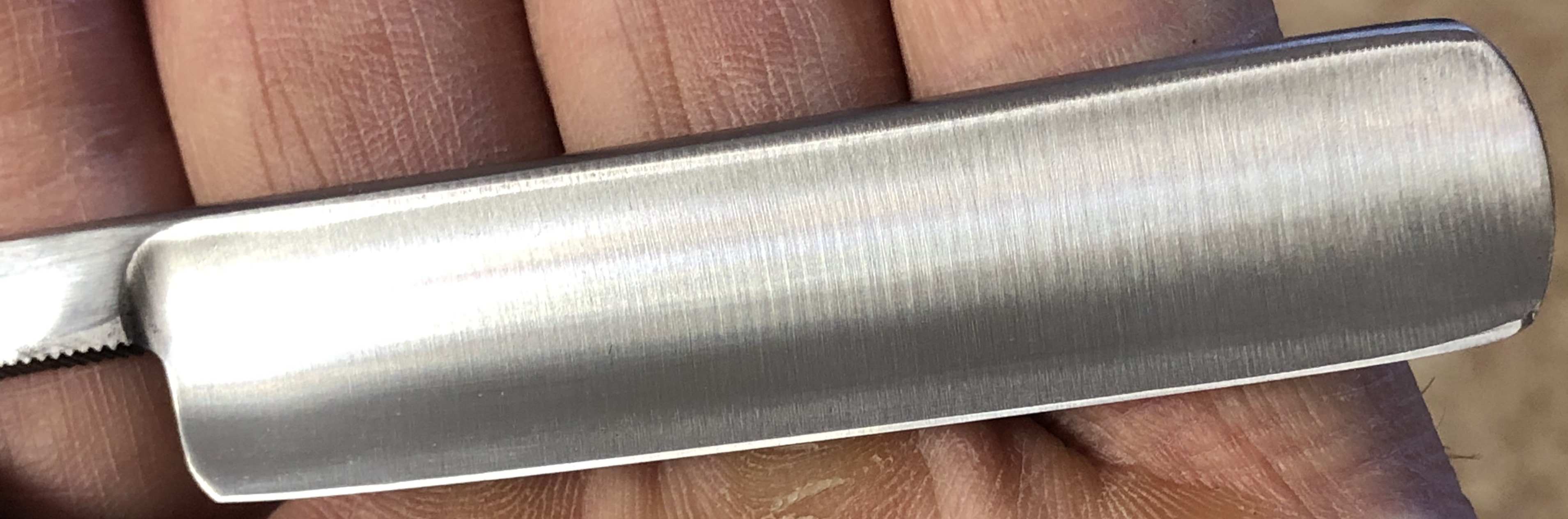 Бритва в идеальном состоянии,без следов пользования.С большой долей вероятности вообще не была ещё в деле.Не разбиралась.Немного освежил клинок от патины, на самых тонких абразивах и полирнул.Состояние новой бритвы.Идеальная геометрия:кромочка равномерна по всей длине.Сталь чистая, без дефектов.