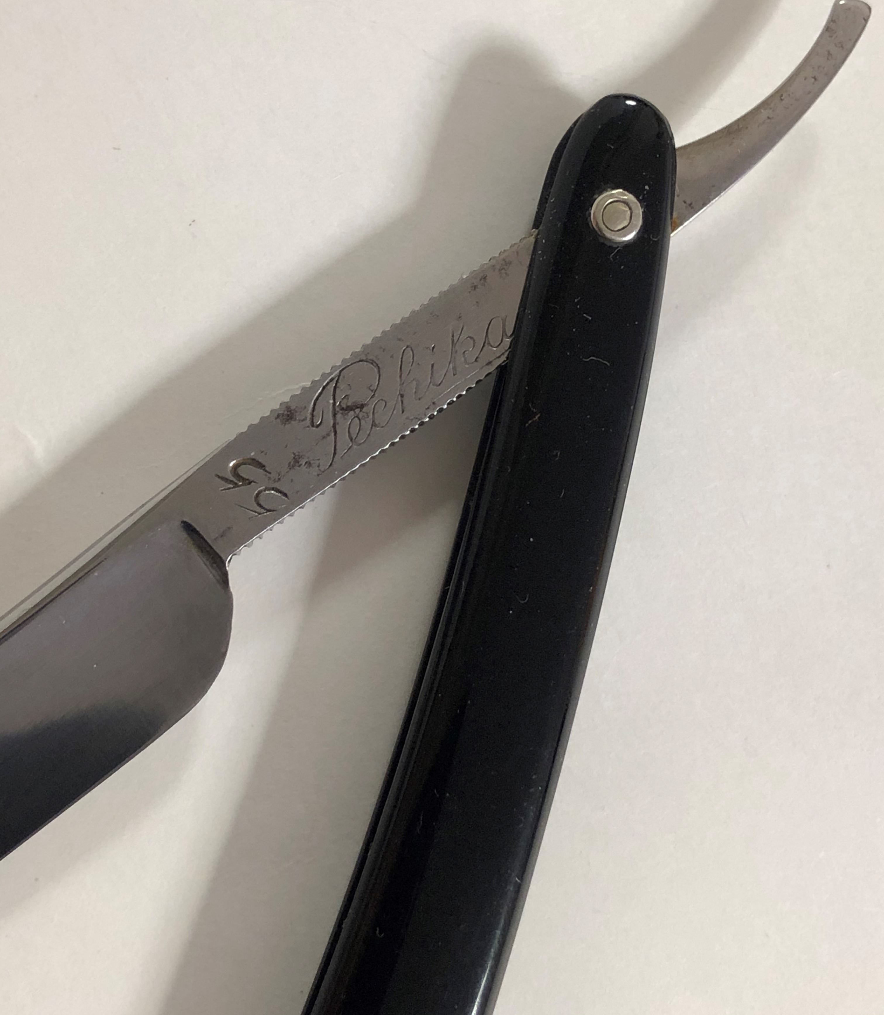 Не разбиралась и не ремонтировалась мной.Все полностью в оригинале, включая коробочку. Родная шлифовка и полировка.Сталь чистая,без критичных дефектов.(несколько "точек времени" на эрле не в счет).Идеальная геометрия клинка. Заточена и готова кбритью.