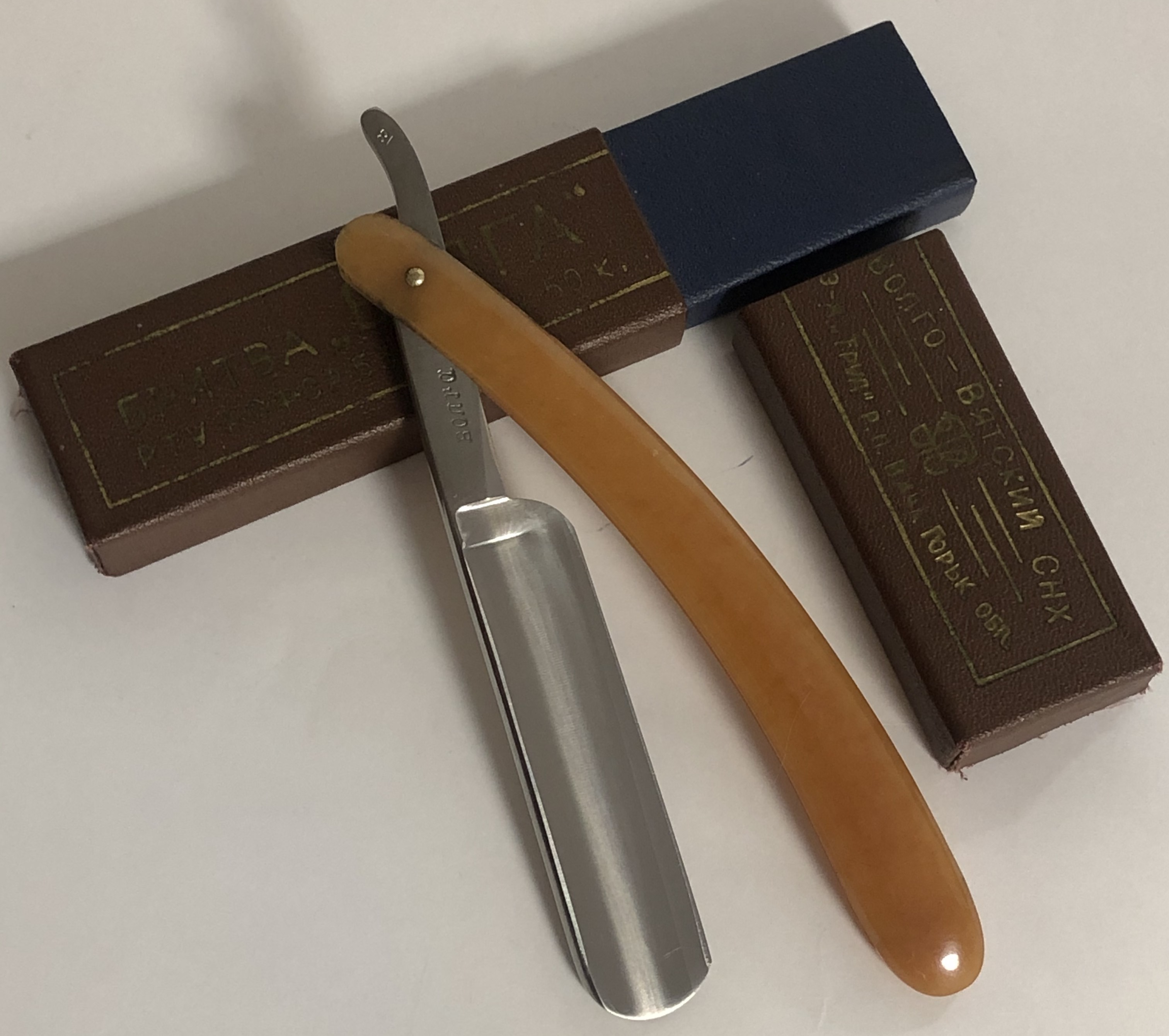 Довольно бодренькая старушка, с элементами патины на лицевой стороне клинка.Не стал ещё вычищать, чтобы картинку сохранить, да и смысла никакого не увидел,так как данные "следы времени" никоим образом не скажутся на дальнейшей эксплуатации. (к тому же, на фото следы видны отчетливо, а наяву практически незаметны).Не разбиралась.Немного освежил обратную сторону полотна и район осевого пина. Судя по нетронутому обушку, бритва или малопользованная, или непользованная совсем.Идеальная геометрия полотна.Заточена и готова к бритью.Не пропустите недорогой вариант себе в коллекцию.Родная коробочка!!