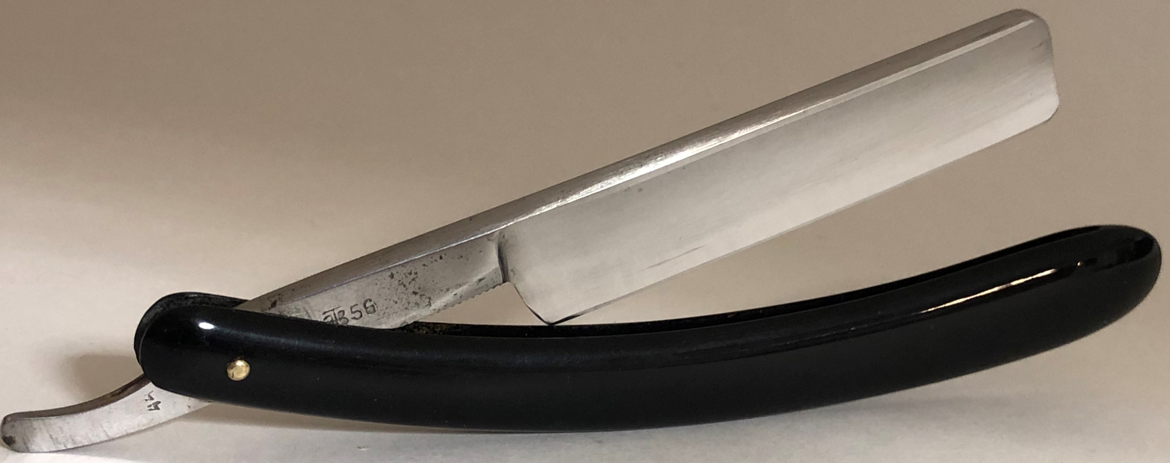 Углеродистая сталь.Про всей видимости 55 это год выпуска бритвы, хотя могу и ошибиться,но не намного.Бритва также без следов пользования.Ничего не разбиралось и не ремонтировалось. Все в оригинале.