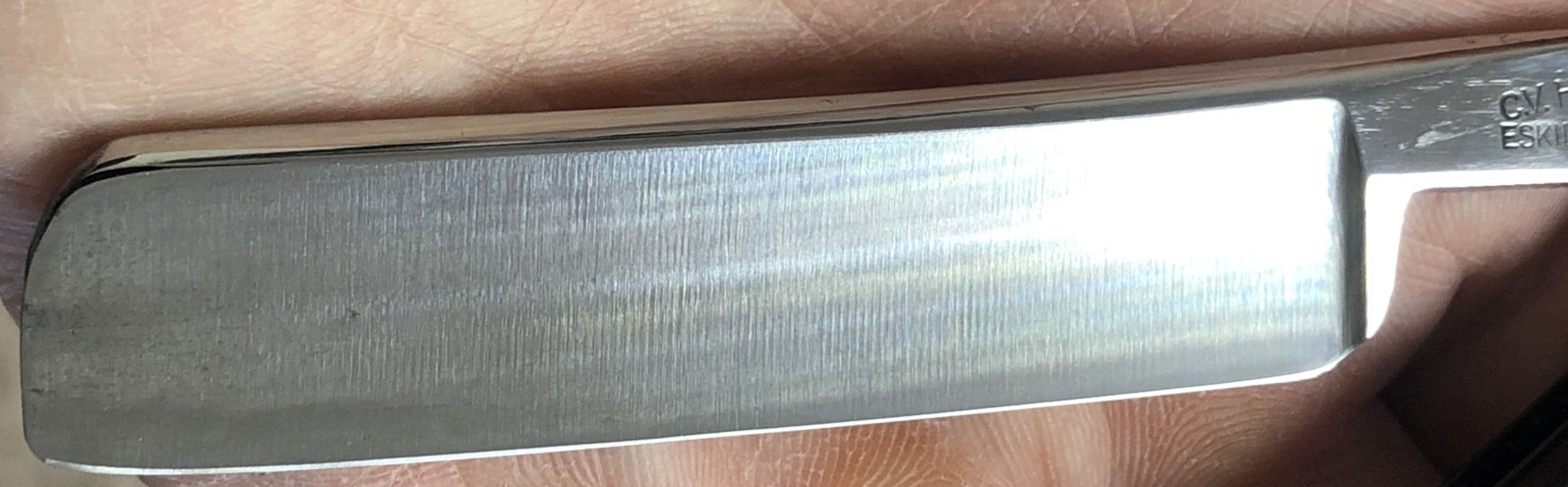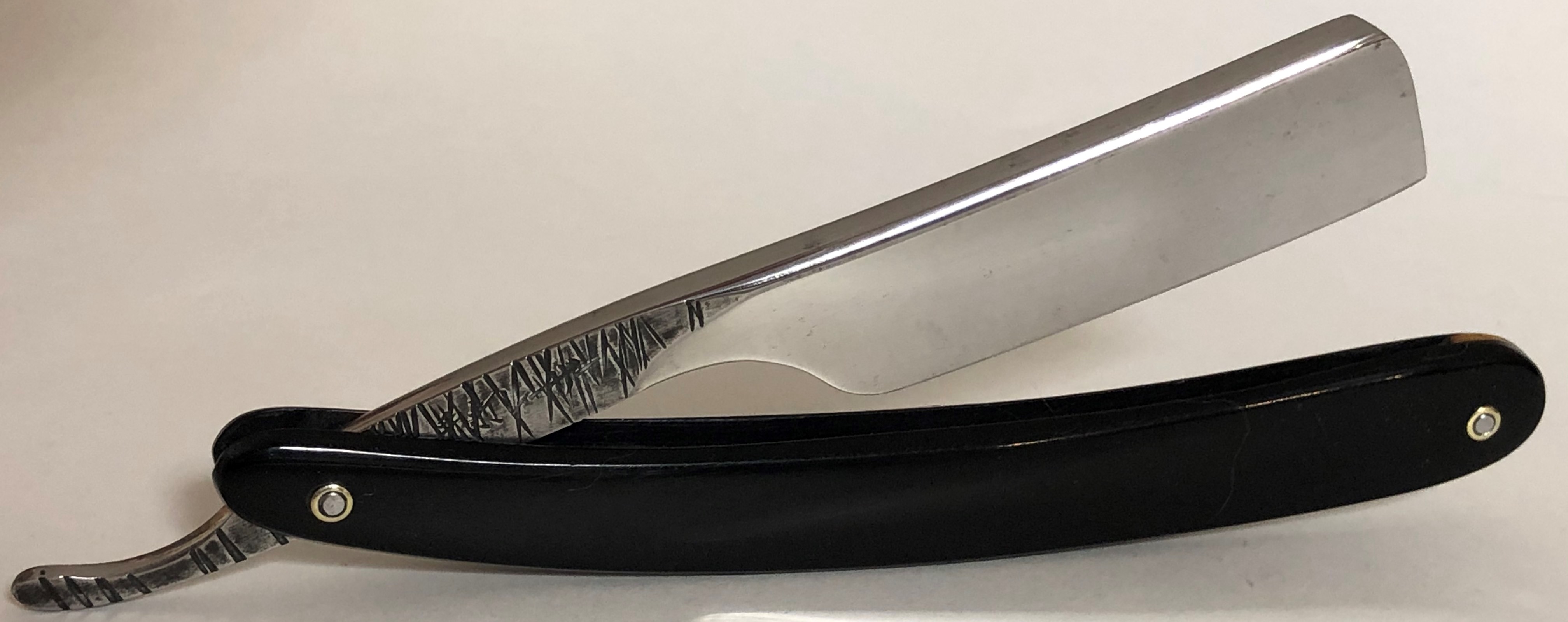 Следов пользования не заметил. Обушок находился в первозданном виде, без следов абразива.Но, пришлось разобрать, немного почистить металл от остатков патины и других дефектов и заново собрать, поставив нормальные втулки, с добавлением внутренних шайб.При шлифовке грани и переходы на "ступеньку" были соблюдены и не зализаны.Если несколько "точек времени" и осталось,но практически незаметны , если смотреть в натуре и не представляют никакого вреда в будущем.Идеальная геометрия клинка:кромочка равномерна по всей длине и еле заметна.Коробочка неоригинальная.Бритва заточена и готова к бритью.