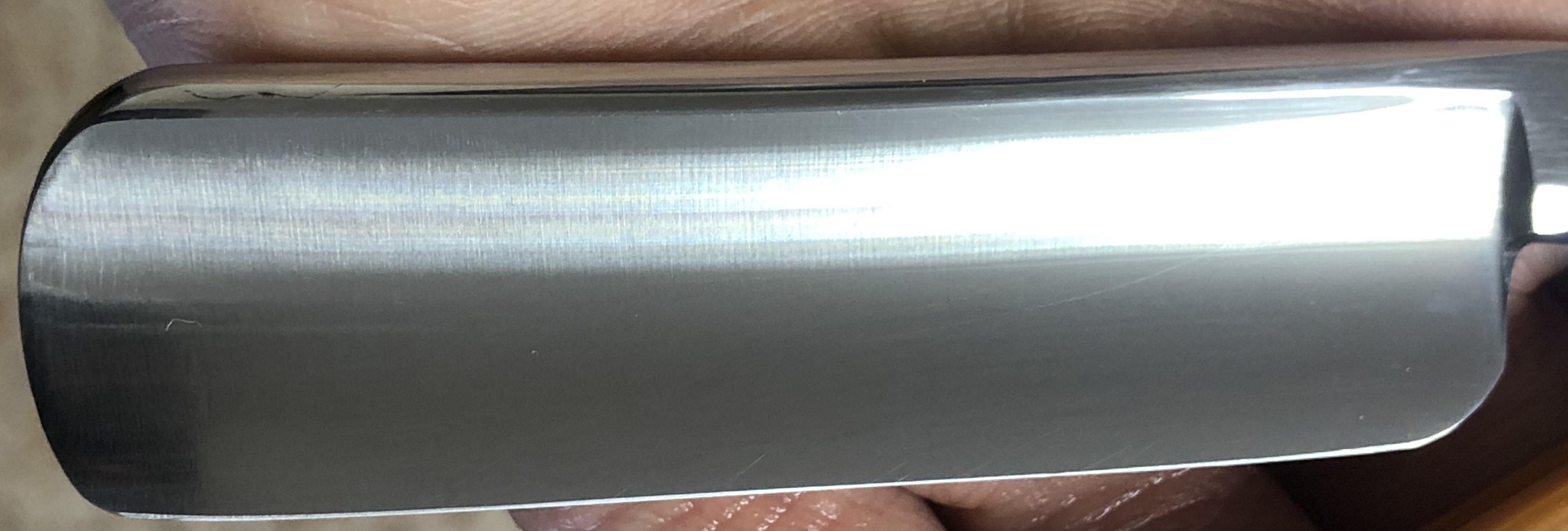 Никаких видимых дефектов не заметил. Все ,как вчера с производства.Элегантная форма клинка, в массе своей несвойственная японским бритвам, в виде тонкого эрля, широкого полотна, с глубокой выработкой .За счет толстого обушка бритва достаточно тяжёлая, что даёт возможность чувствовать ее в руках, при бритье и не резаться часто.Идеальная форма клинка:кромочка равномерна по всей длине и практически незаметна.Отличная "звонкая" сталь способна выдавать качественное и мягкое бритьё. Заточена и готова к бритью.