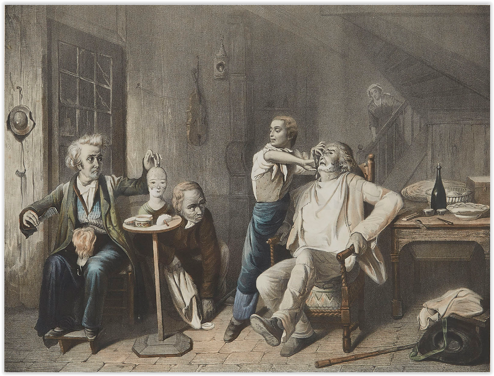 „A view into a barbershop on Capri” „Вид на парикмахерскую на Капри” Nicolas Jacques Conté (1755-1805), Никола Жак Конте – франзузский механик и живописец. Среди прочего, предложил в 1792 году прибегнуть к воздушному шару для наблюдения за неприятелем, в результате чего был назначен директором аэростатического института и начальником бригады аэронавтов. Во время египетской экспедиции оказал Наполеону большие услуги организацией в Каире мастерских для удовлетворения нужд войск. Из описания „Искусство и ремесла Египта”, опубликовано по приказу Наполеона в 1822 году. „The Barber” 1822 г. „Цирюльник” С 2013 г. с кайфом бреюсь опасной бритвой пять раз в неделю, в три прохода.