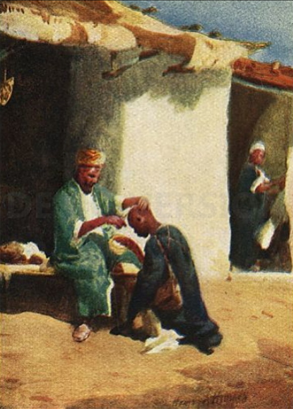 „The Barber Shop, Old Marrakech, Morocco”, „Цирюлня, Старый Марракеш, Марокко” Philip William May (1864-1903) Филип Уильям Мэй был английским карикатуристом. „A dangerous Barber with a flippant attitude having won a bet” „Опасный цирюльник с легкомысленным поведением, выигравший пари” 1901 г. Весьма курьёзно пояснение к этой гравюре. Цирюльник объясняет: „Да, сэр, порядки у нас строги, сэр. Если мы поцарапаем клиента, нас оштрафуют на три пенса, а если мы его порежем, нас оштрафуют на шесть пенсов. Но я только что, в пари выграл соверен (то есть, крупная золотая монета)”. Дескать, он хвастается, что не боится быть оштрафованным, если порежет клиента. С 2013 г. с кайфом бреюсь опасной бритвой пять раз в неделю, в три прохода.