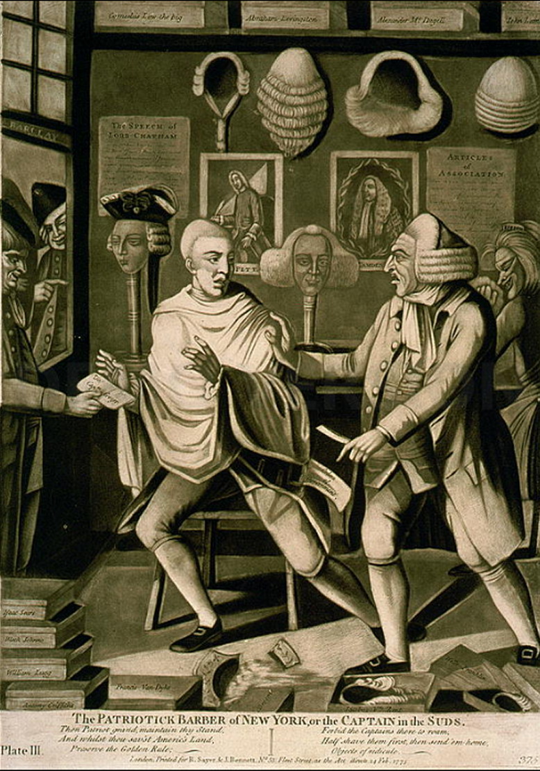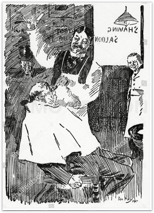 Действие происходит в период Американской революцией (Война за независимость США, 1775-1783). „The patriotick barber of New York, or the Captain in the suds” „Патриотический цирюльник Нью-Йорка или капитан в пене” 1775 г. Карикатура показывает нью-йоркского парикмахера, который отказывается закончить брить клиента, узнав о его британской идентичности. Встречается и в цветном виде. 1860-х годов - первое посольство Японии в Соединенных Штатах. Это была первая дипломатическая миссия Японии в США. Опубликовано в иллюстрированной газете Фрэнка Лесли в субботу 6 июня 1860 г. "The Japanese seeing a man shaved in the barber's shop adjoining Willard's Hotel." „Японцы смотрят на бритья мужчину в парикмахерской, примыкающей к отелю Willard's” С 2013 г. с кайфом бреюсь опасной бритвой пять раз в неделю, в три прохода.