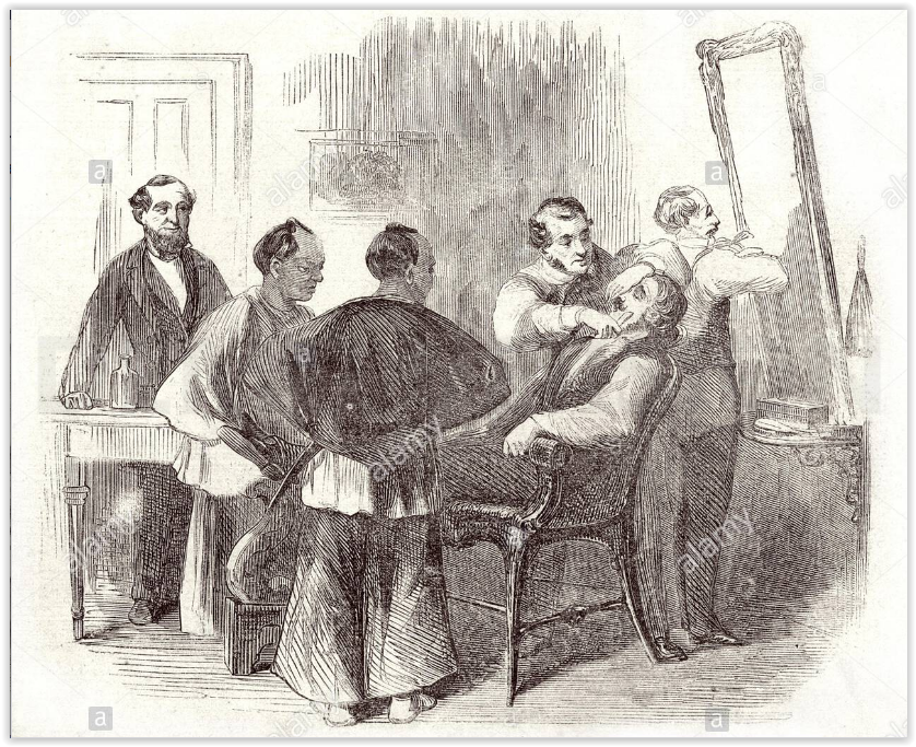 „Вarber shaving a frighten man” „Цирюльник бреет напуганного мужчину” около 1880 г. Henry William Bunbury, Генри Уильям Банбери (1750-1811) был английским карикатуристом. Он родился и вырос в бедной крестьянской семье – Шутка! Он был вторым сыном сэра Уильяма Банбери - пятый баронет (см. Баронеты Банбери) из Милденхолла, Суффолк и происходил из старой нормандской семьи. „A barber shaving a disgruntled man” „Парикмахер бреет недовольного мужчину”
