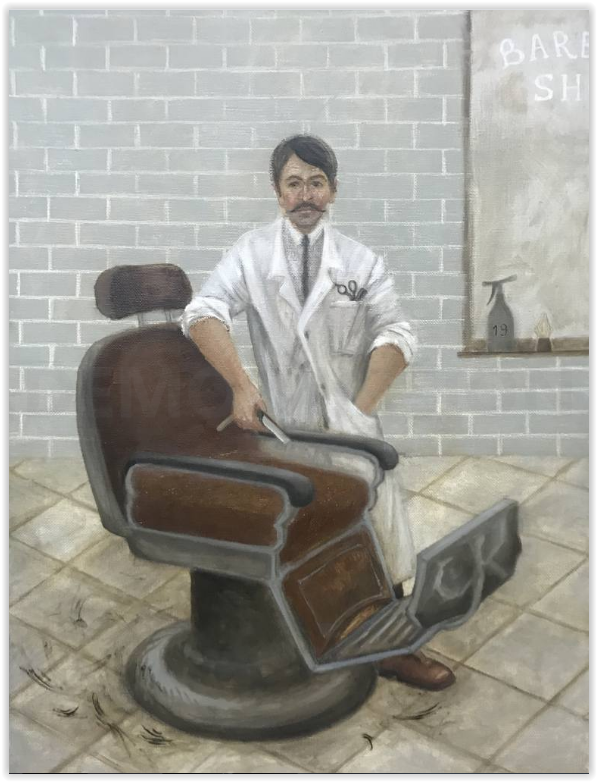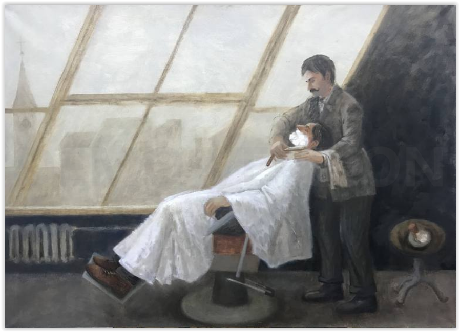 Кирилл Сабецкий, Kirill Sabetski Родился в 1979 году в Москве, в семье потомственных немецких купцов Бартельс-Флёр, иммигрировавших в Россию в конце VIII начале IX века. Учился живописи и рисунку в Московском государственном академическом художественном институте имени В.И. Сурикова. Кирилл Сабецкий „Брадобрей старой школы” „Old school barber” 2019 г. „Режущее остриё” „Cutting edge” 2019 г.