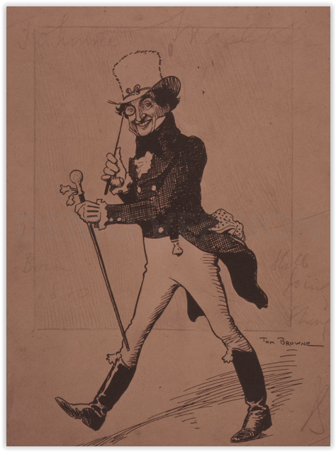„Barber with razor and man" 1899 г. „Парикмахер с бритвой и мужчина” Том Браун зарабатывал себе на жизнь рисованием для лондонских комедийных газет. Кстати, логотип виски „Johnnie Walker”, напыщенный персонаж с моноклем, был создан Брауном в 1908 году. Вот как это случилось. На рубеже веков, когда Джордж Патерсон и Александр Уокер запустили Red Label и Black Label, которые тогда назывались Special Old Highland Whisky и Extra Special Old Highland Whisky, они хотели визуально передать уникальную точку зрения бренда. Они провели конкурс на подходящие художественные работы, но ничего не подходило под все требования. В конечном итоге логотип придумал карикатурист по имени Том Браун. Во время обеда с лордом Стивенсоном, одним из директоров Уокера, Браун перевернул карточку меню и нарисовал на спине знаменитую фигурку Шагающего человека: После того восхитительного обеда Браун выпустил серию рекламных рисунков про Уокера-шагающего человека. Johnnie Walker, Logo by Tom Browne 1908 г.: Надеюсь, было интересно.