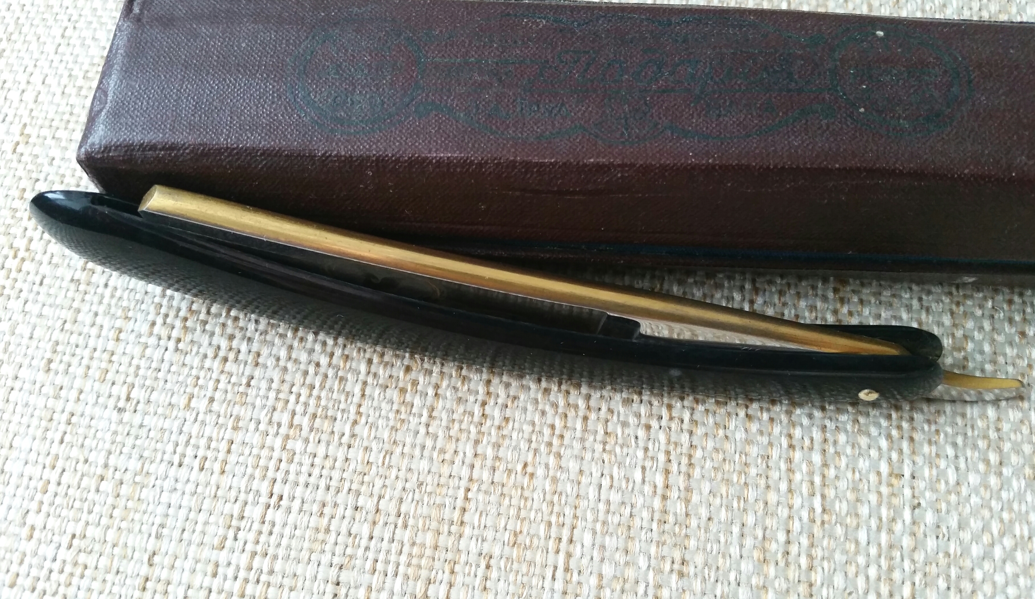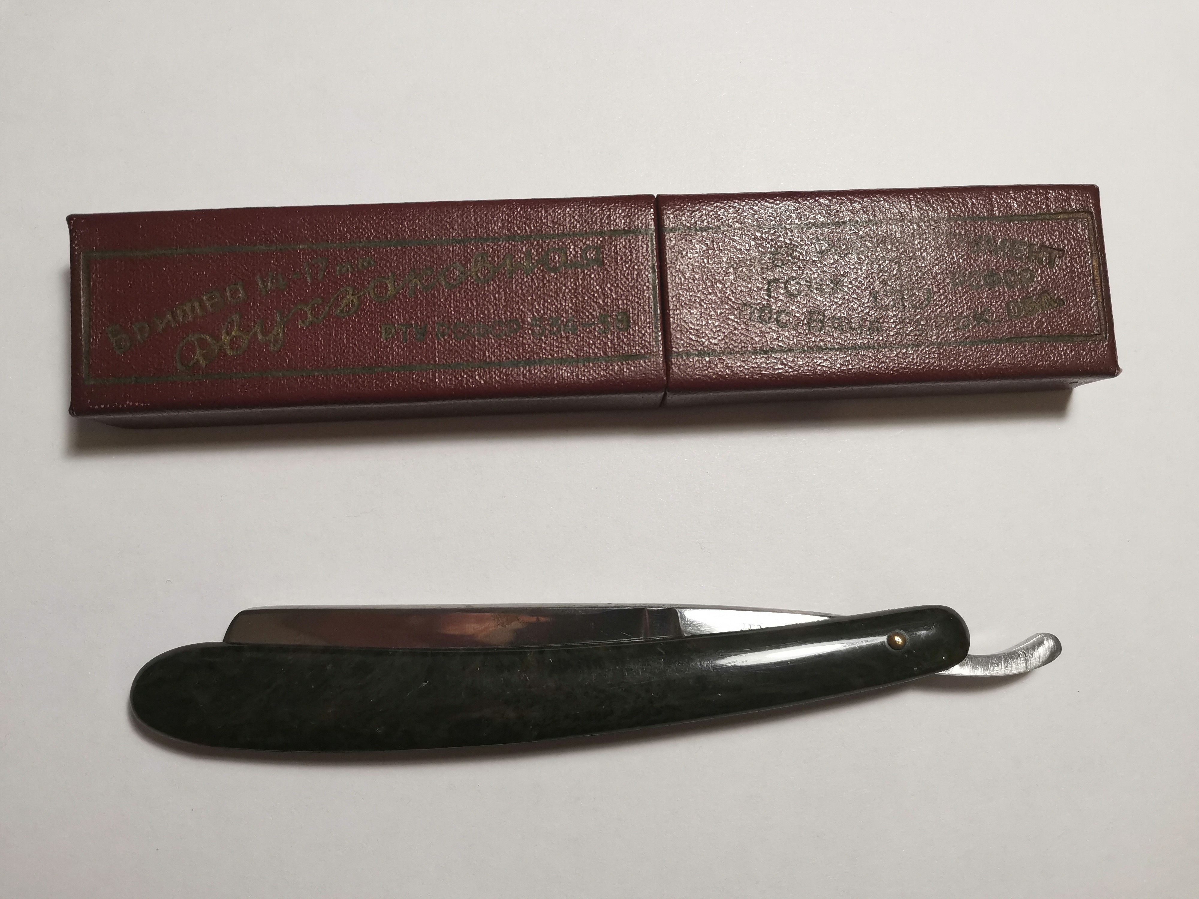 «Яхта» от завода Труд Вача, 1955 год. Непользованная, с родной коробочкой. По сравнению с «Яхтами» 1960-ых, эта более массивная. Сталь великолепная, затачивать одно удовольствие.