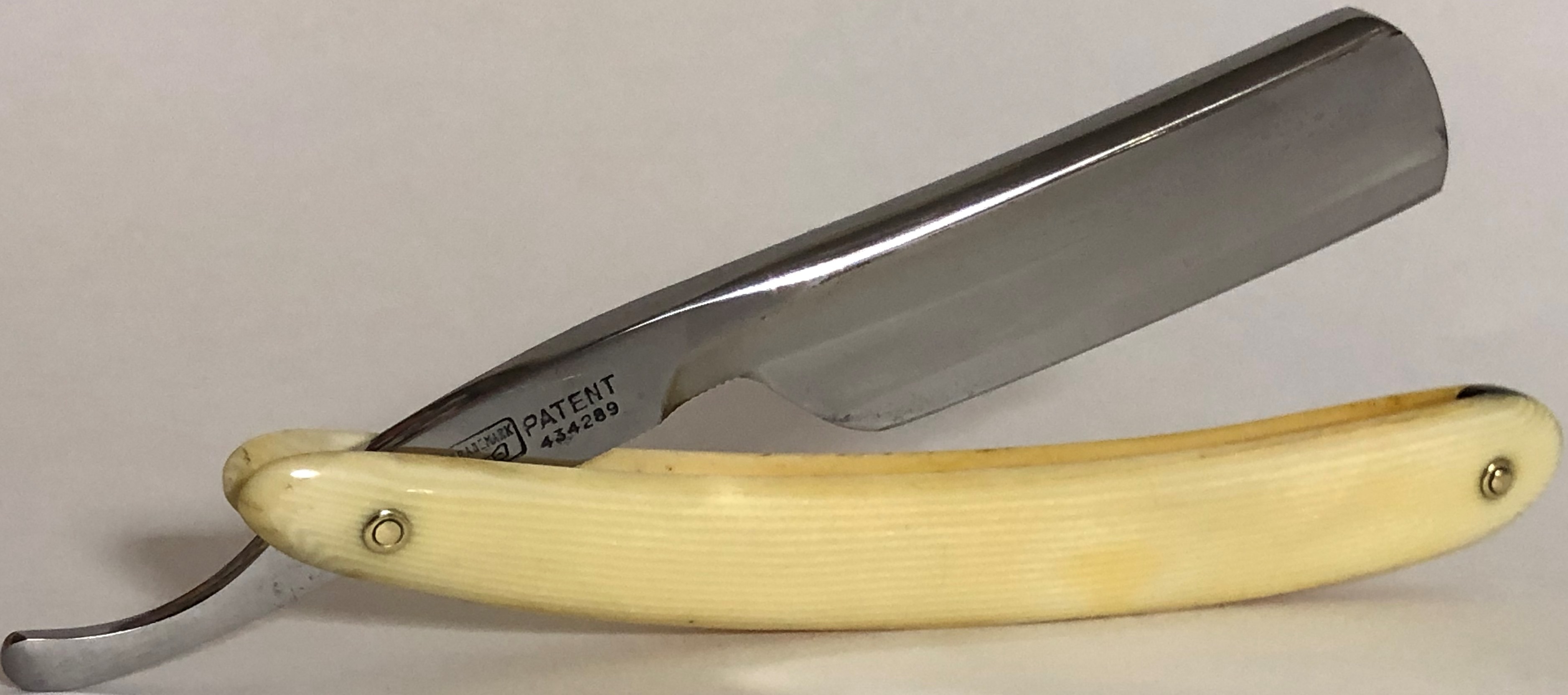 Следов пользования не заметил. Обушок находился в первозданном виде, без следов абразива.Но, пришлось разобрать, немного почистить металл от остатков патины и других дефектов и заново собрать, поставив нормальные втулки, с добавлением внутренних шайб.При шлифовке грани и переходы на "ступеньку" были соблюдены и не зализаны.Если несколько "точек времени" и осталось,но практически незаметны , если смотреть в натуре и не представляют никакого вреда в будущем.Идеальная геометрия клинка:кромочка равномерна по всей длине и еле заметна.Коробочка неоригинальная.Бритва заточена и готова к бритью.