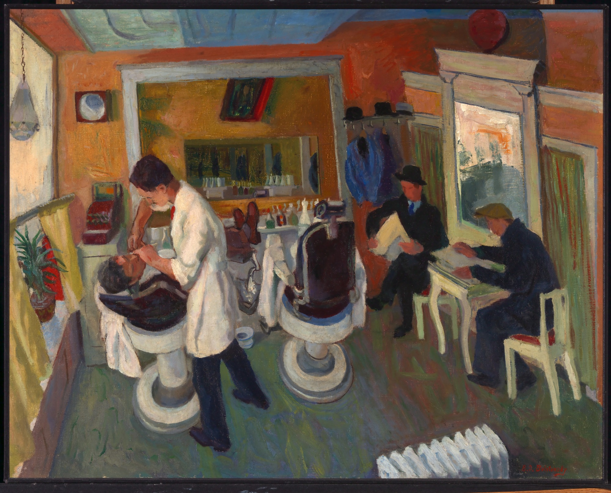Опасная бритва в искусстве (картины, рисунки, фото, тату)Илья Болотовский (родился в Санкт-Петербурге, Россия в 1907 г. - умер в Нью-Йорке в 1981 г.), "В парикмахерской", 1934 год, холст, масло, Смитсоновский музей американского искусства, Министерство труда США, 1964.