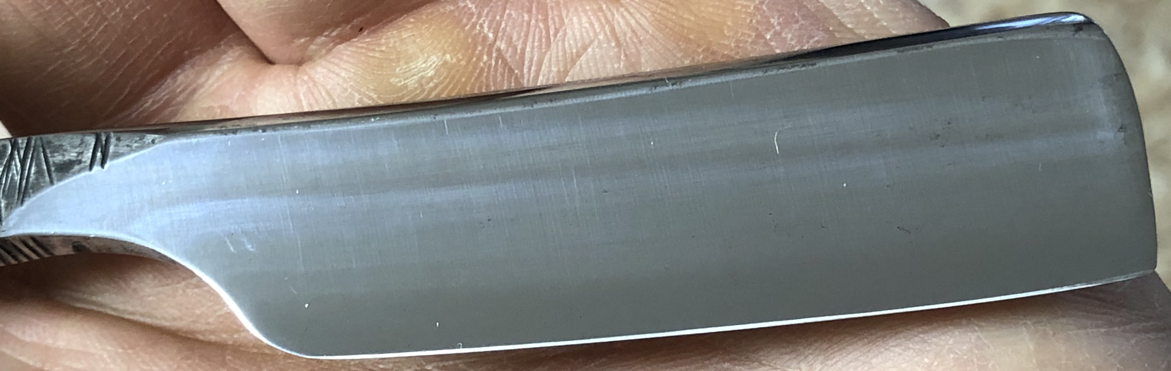 Бритву почистил, исправил геометрию полотна, в меру своих возможностей, поменял старую алюминиевую ручку на оправу от американского донора, полирнул и сформировал кромку. Осталось поточить до конца и все.Следы старины на эрле оставил,для красоты, по мотивам японских кованых клинов ручной работы.