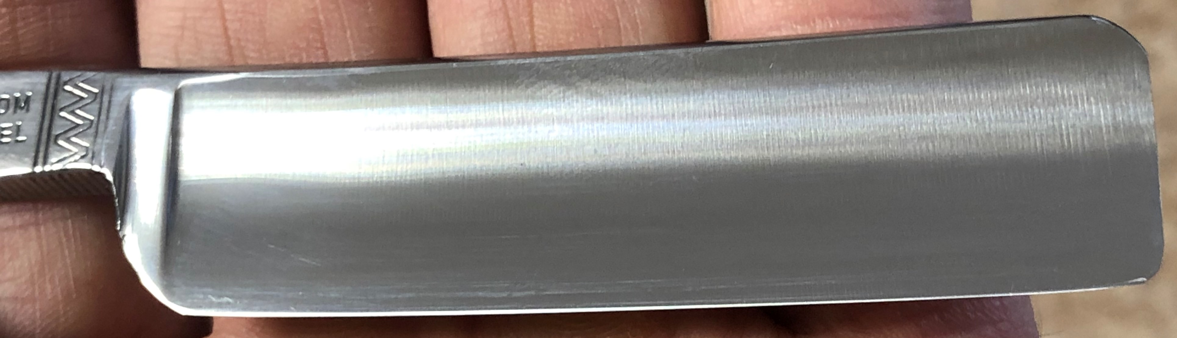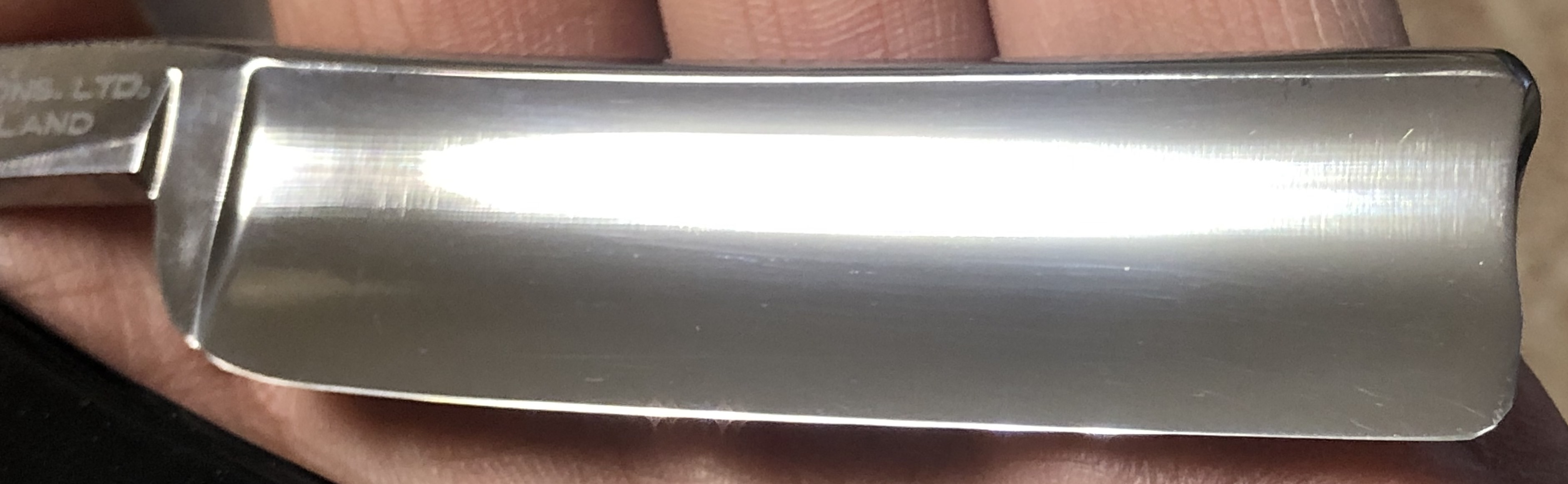 Никаких видимых дефектов не заметил. Все ,как вчера с производства.Элегантная форма клинка, в массе своей несвойственная японским бритвам, в виде тонкого эрля, широкого полотна, с глубокой выработкой .За счет толстого обушка бритва достаточно тяжёлая, что даёт возможность чувствовать ее в руках, при бритье и не резаться часто.Идеальная форма клинка:кромочка равномерна по всей длине и практически незаметна.Отличная "звонкая" сталь способна выдавать качественное и мягкое бритьё. Заточена и готова к бритью.