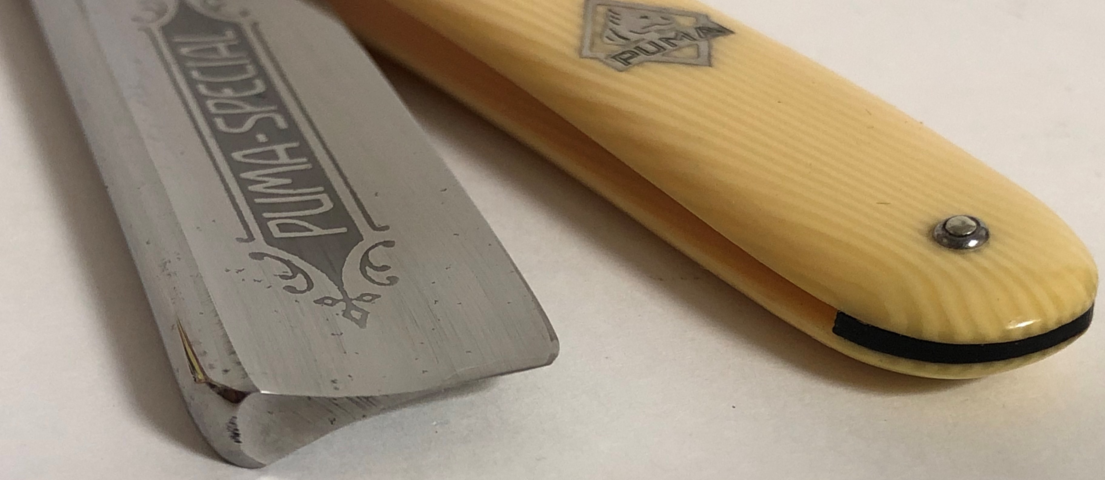 Следов пользования не заметил. Обушок находился в первозданном виде, без следов абразива.Но, пришлось разобрать, немного почистить металл от остатков патины и других дефектов и заново собрать, поставив нормальные втулки, с добавлением внутренних шайб.При шлифовке грани и переходы на "ступеньку" были соблюдены и не зализаны.Если несколько "точек времени" и осталось,но практически незаметны , если смотреть в натуре и не представляют никакого вреда в будущем.Идеальная геометрия клинка:кромочка равномерна по всей длине и еле заметна.Коробочка неоригинальная.Бритва заточена и готова к бритью.